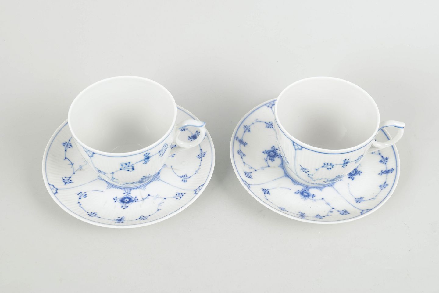 Royal Copenhagen Blue Fluted Plain breakfast cups with saucers, pair.