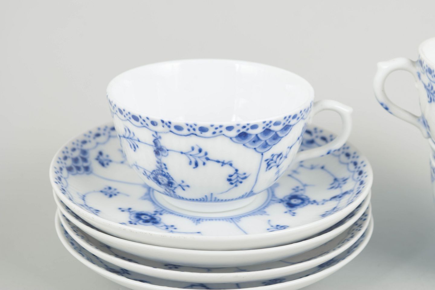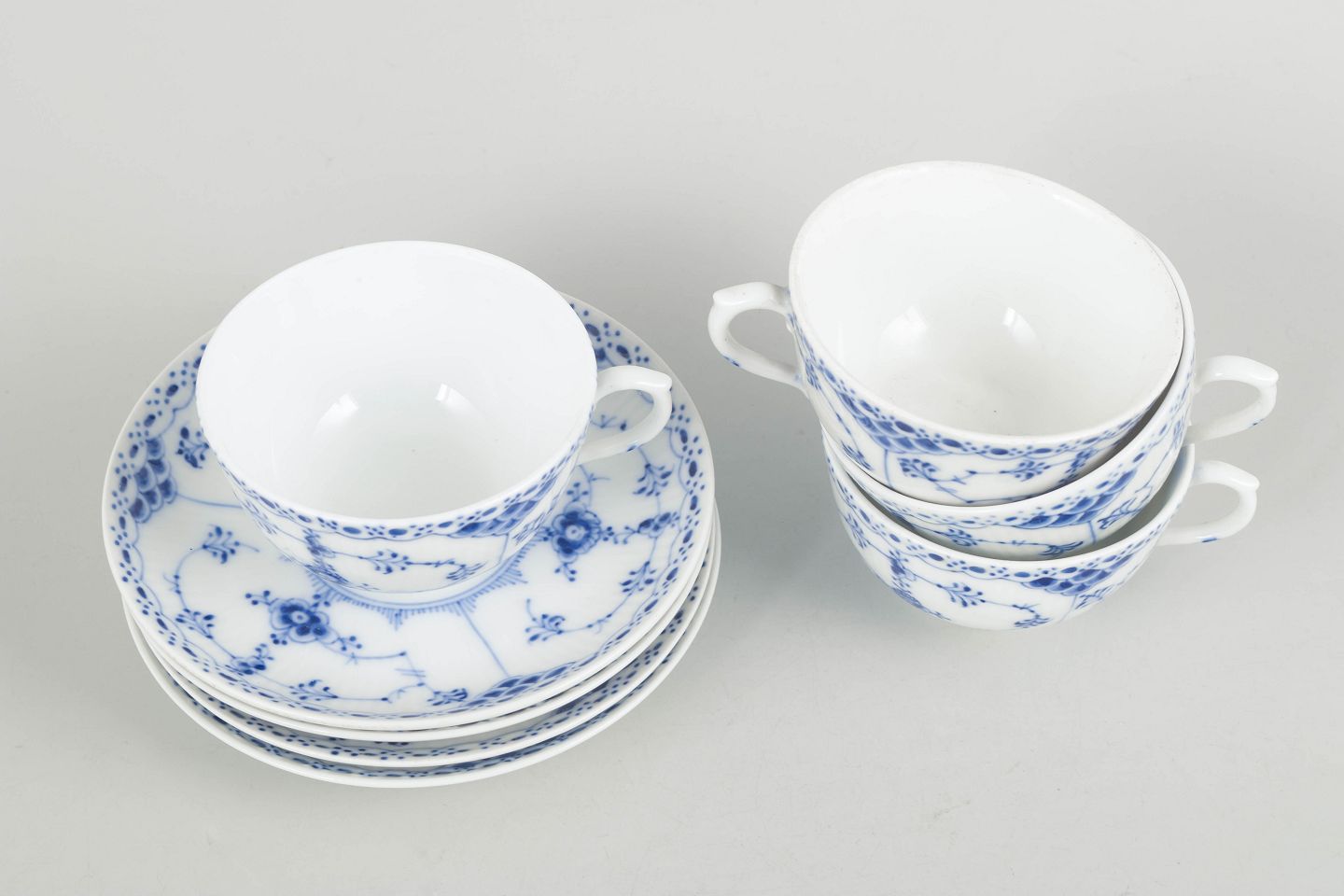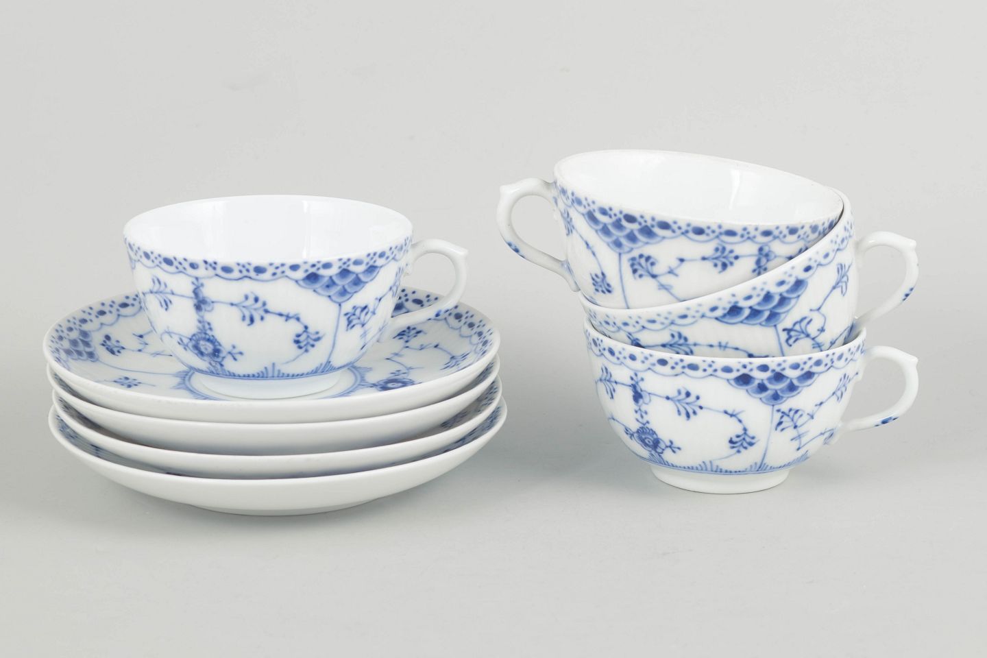 Royal Copenhagen Blue Fluted Half Lace coffee cups with saucers, set of four.