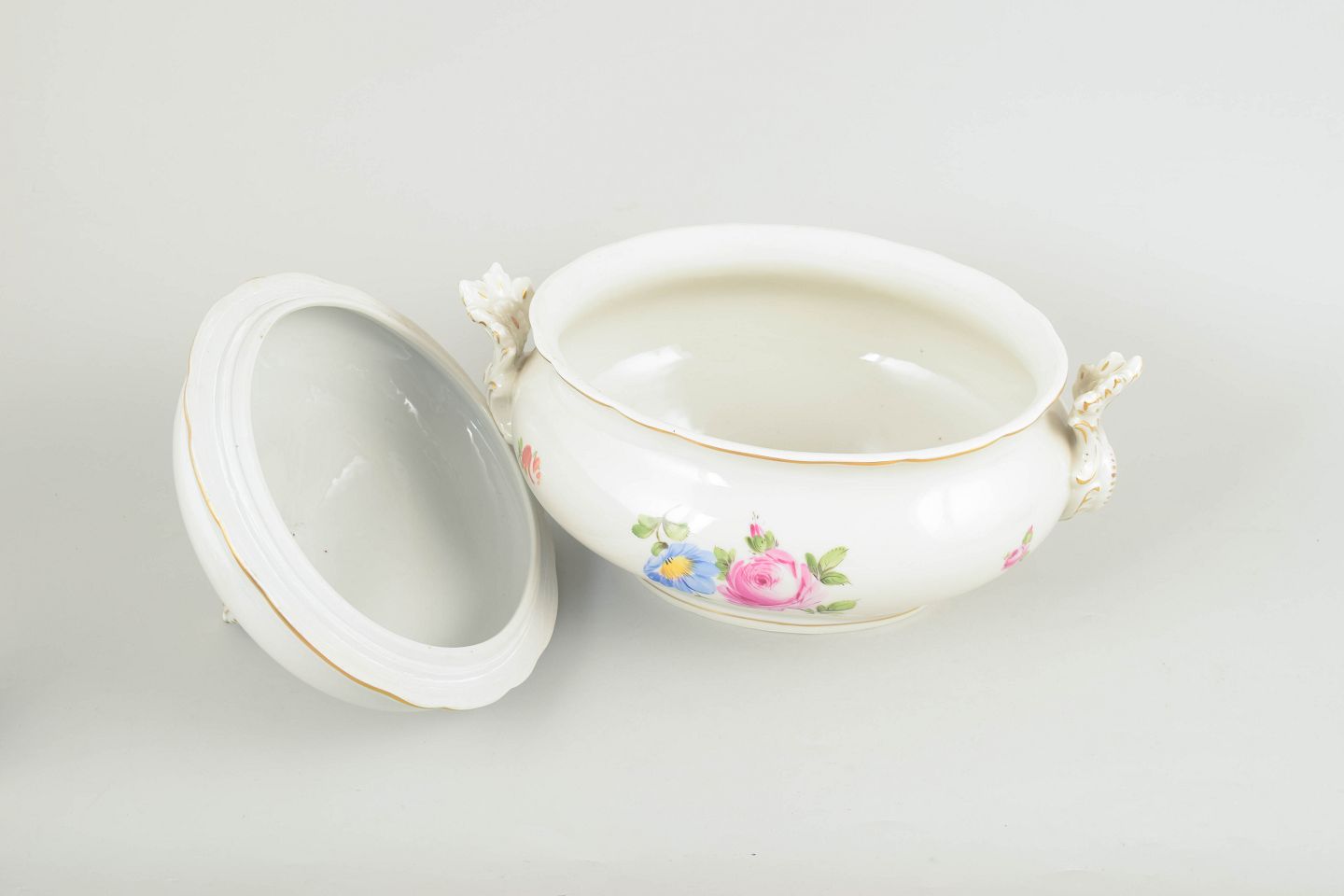 Large hand-painted porcelain tureen with polychrome floral decoration and gilt detailing, executed in the classic Saxon flower pattern. Unmarked.