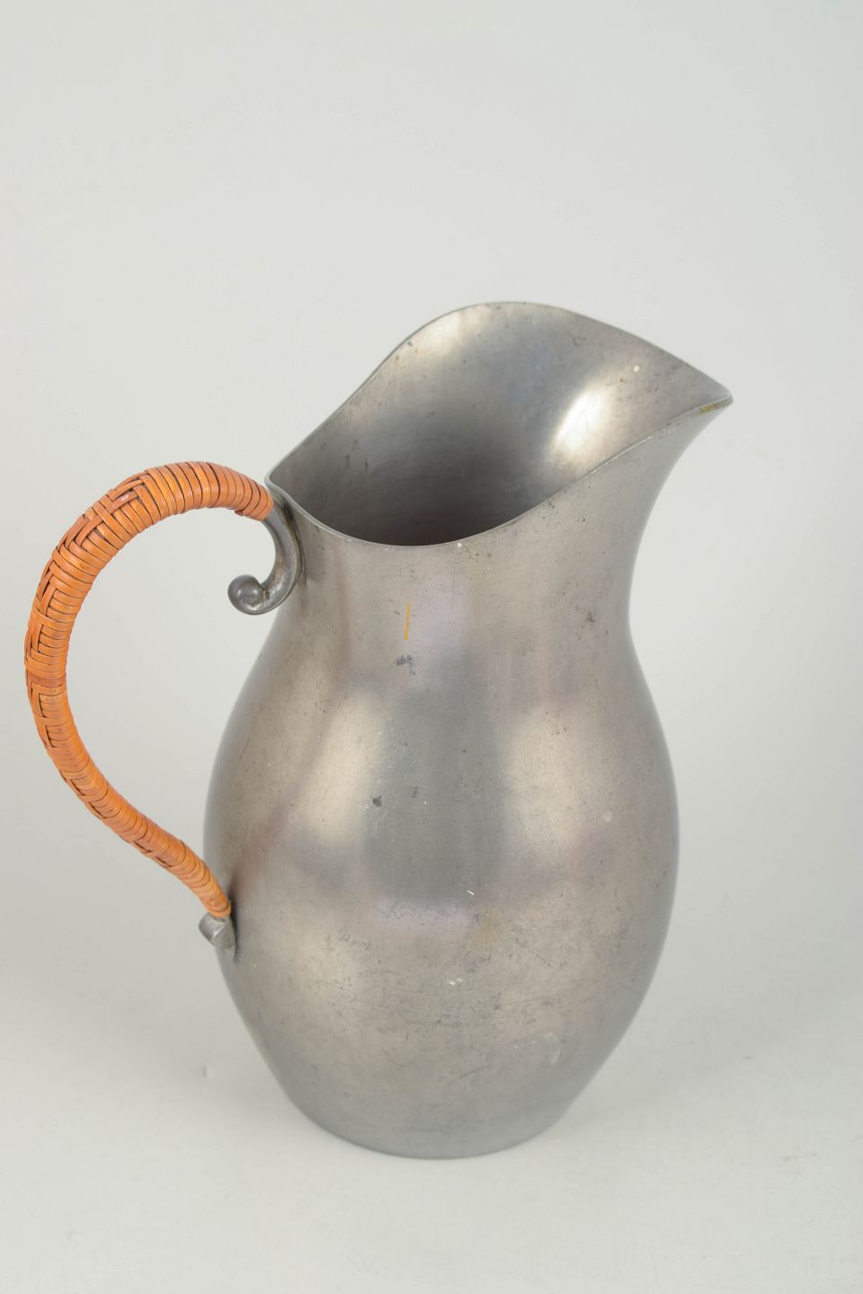 Large pitcher in pewter with wicker handle and softly curved body, executed in an elegant art deco design. Model 502.