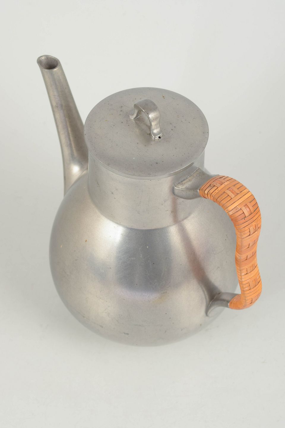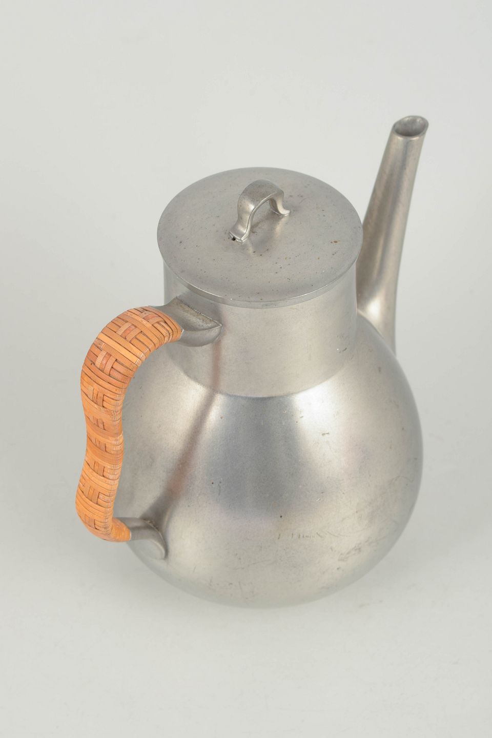 Coffee pot in pewter with wicker handle and an elegant rounded body, executed in a refined art deco design. Model 2661.
