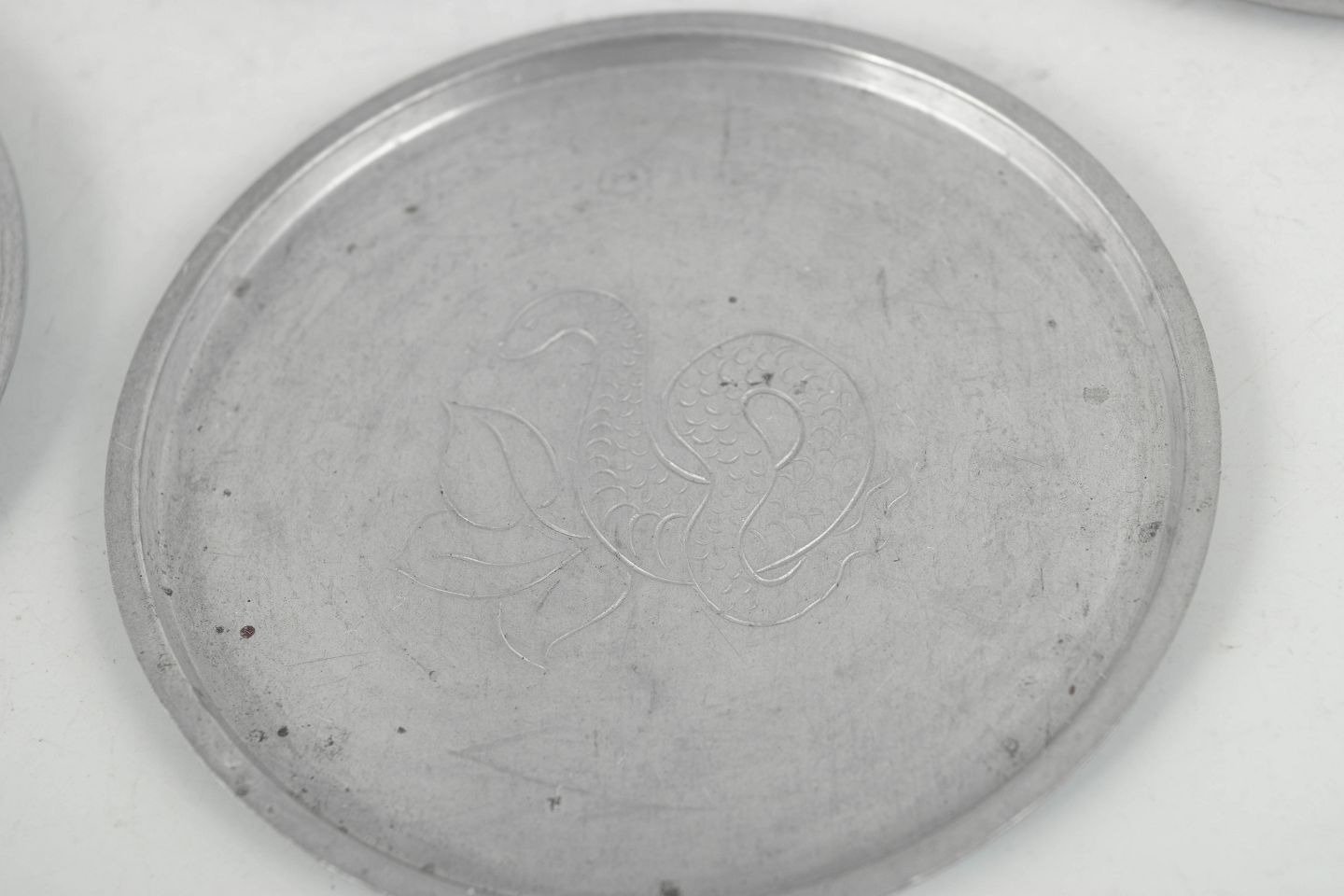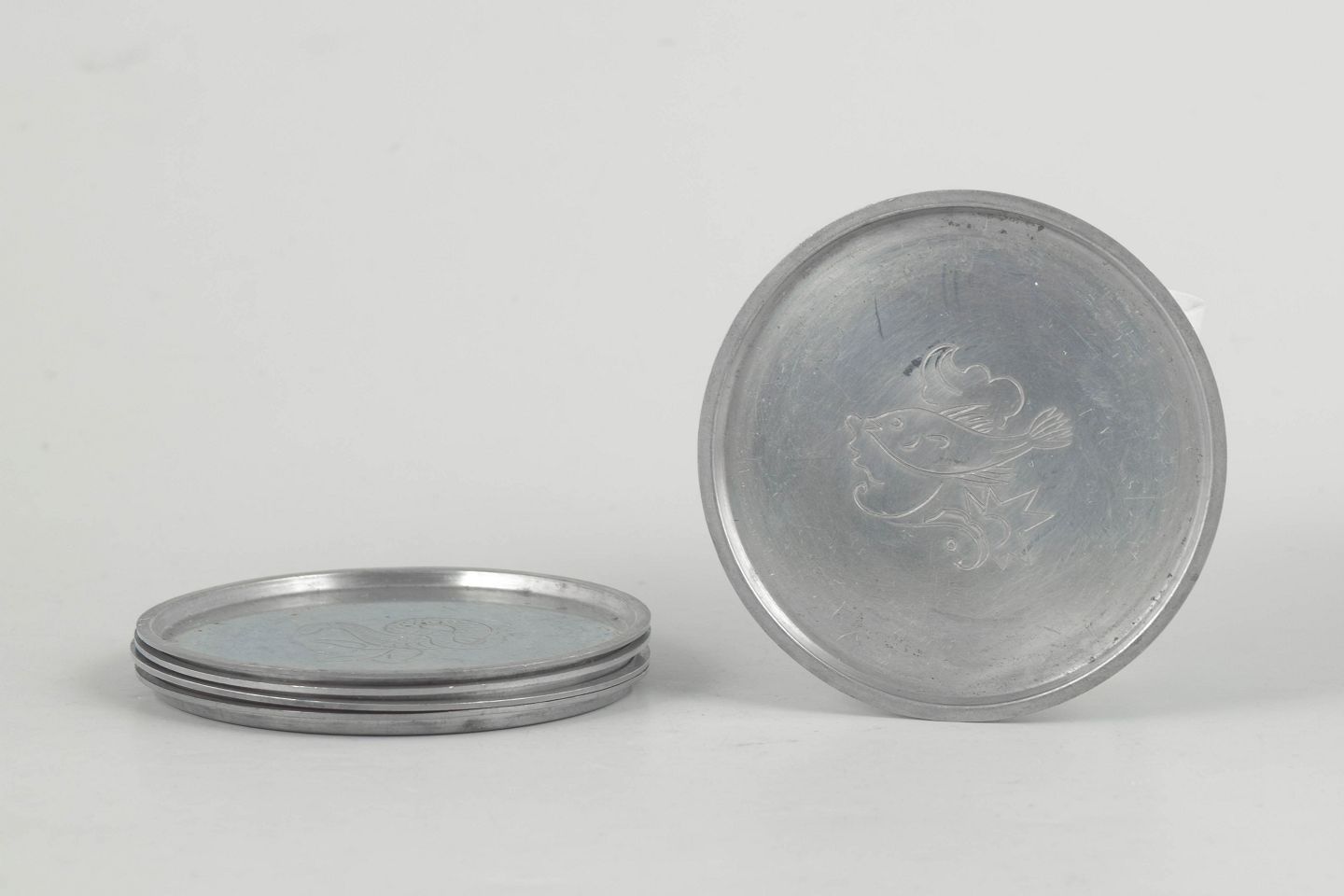 Set of five coasters in pewter with engraved animal motifs in a stylised art deco design. Model 1176.