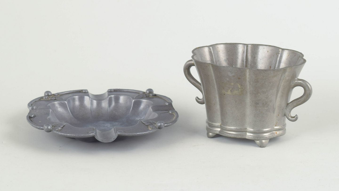 Vase and dish in pewter, executed in an elegant art deco design with soft curves and stylised details. Vase model 46. Dish model 1214.