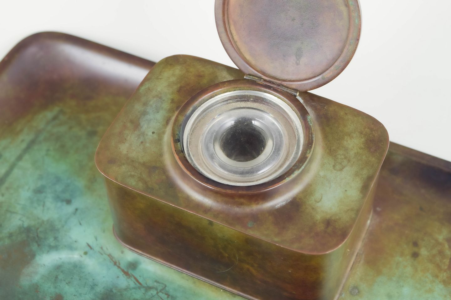 Ink well in alloyed bronze with a rectangular tray, square container with lid, and original glass insert. Model LB 1820.