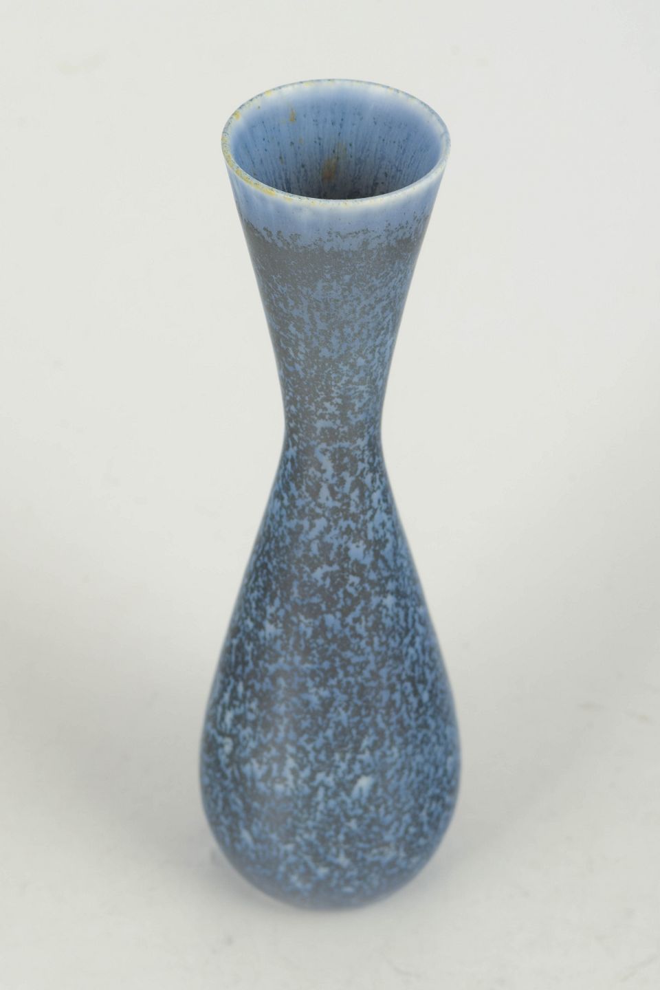Slender organically shaped stoneware vase with a beautiful blue mottled glaze and a gently constricted neck. A characteristic example of Stålhane’s work with refined forms and nuanced glazing.