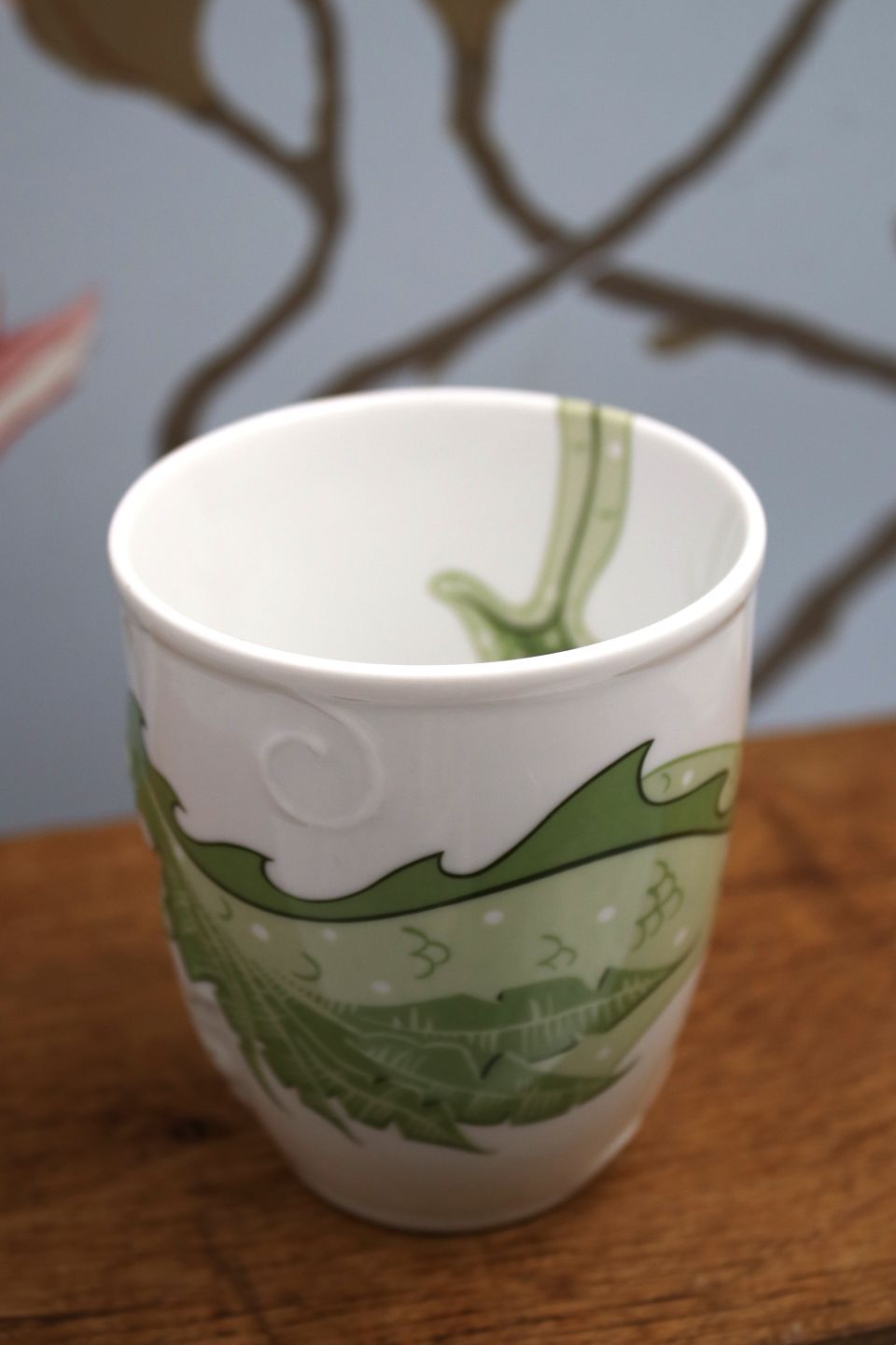 The porcelain mug is a rare prototype without the RC stamped on the bottom. H: 9cm. Dia.: 7.5cm.