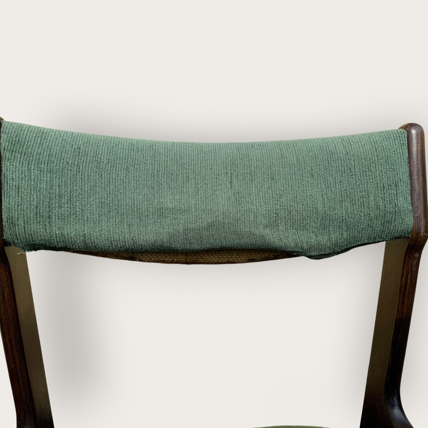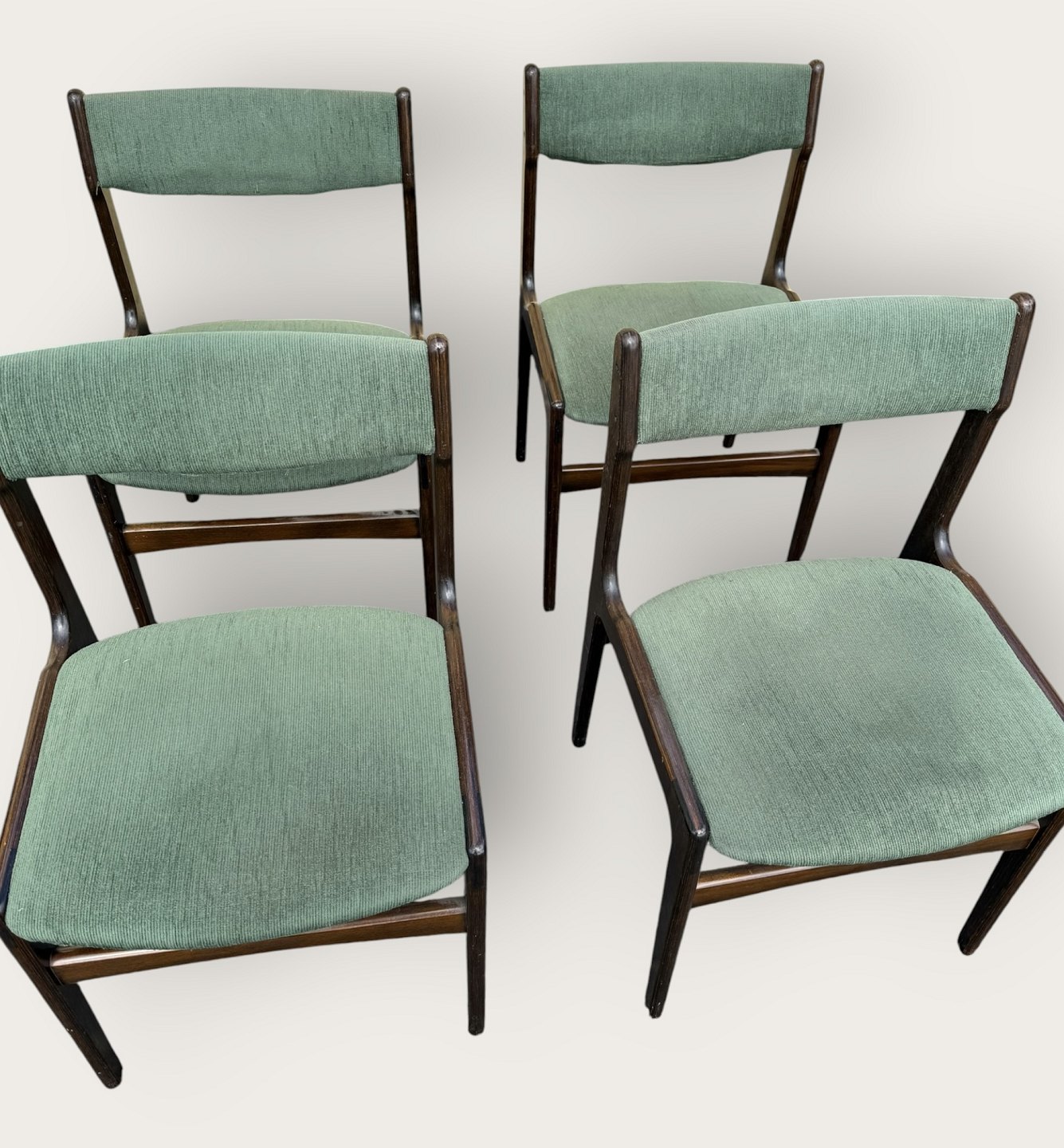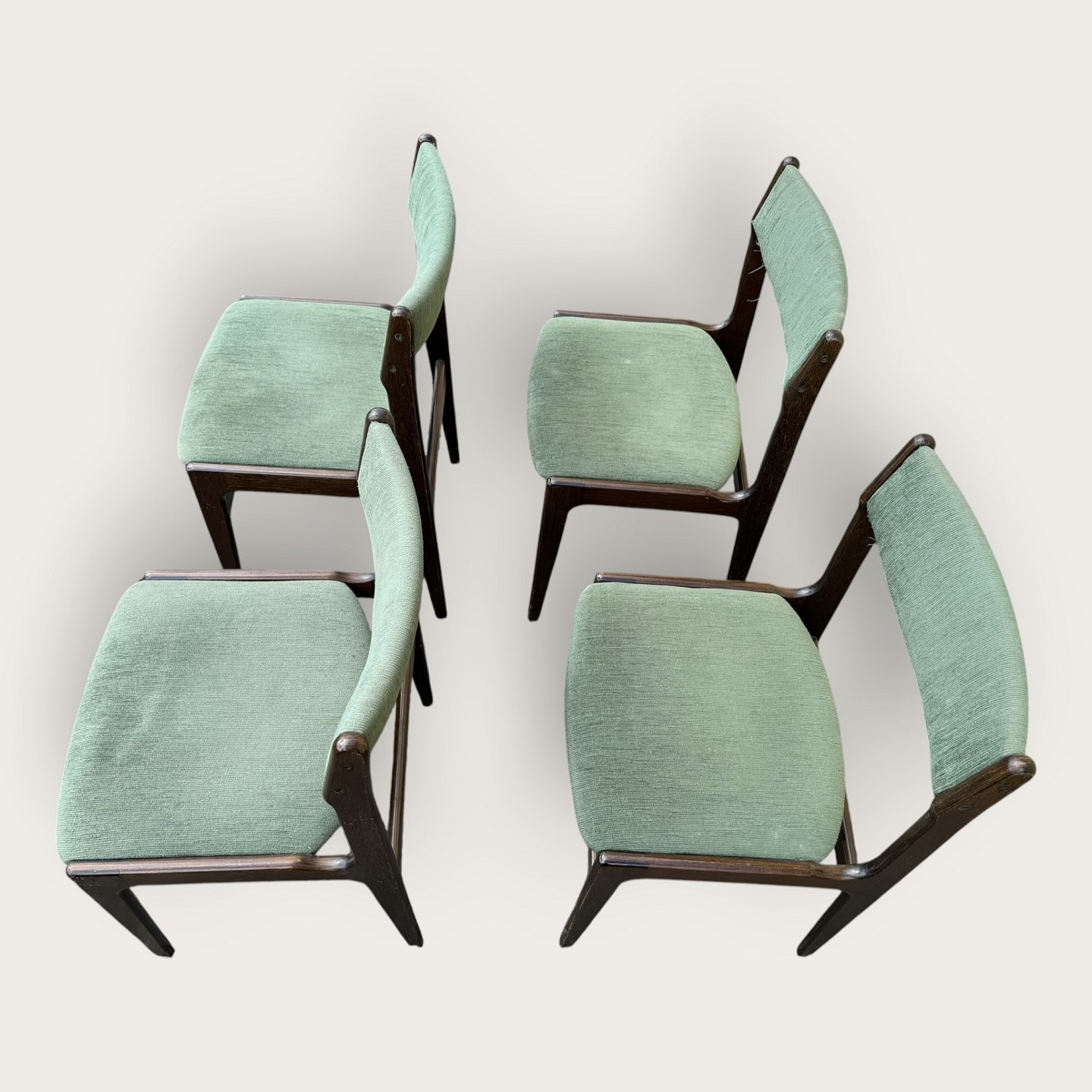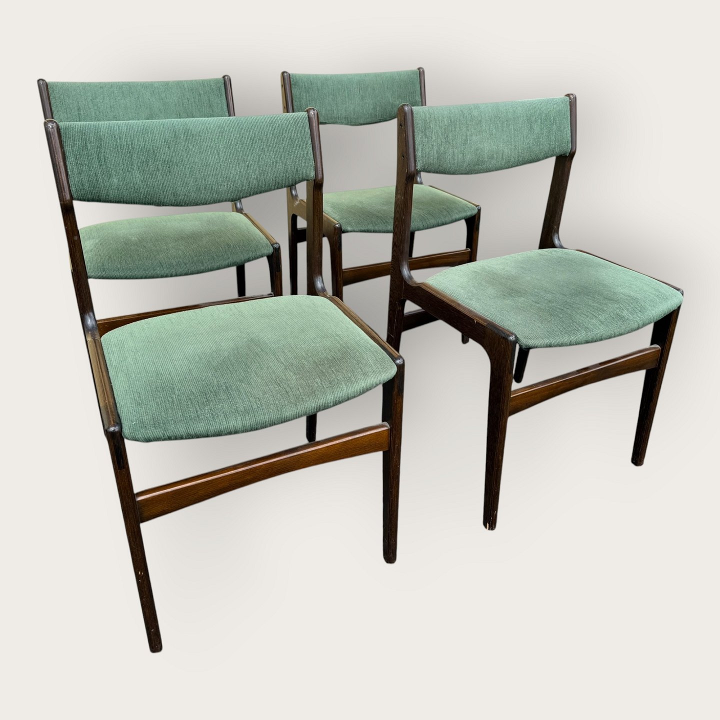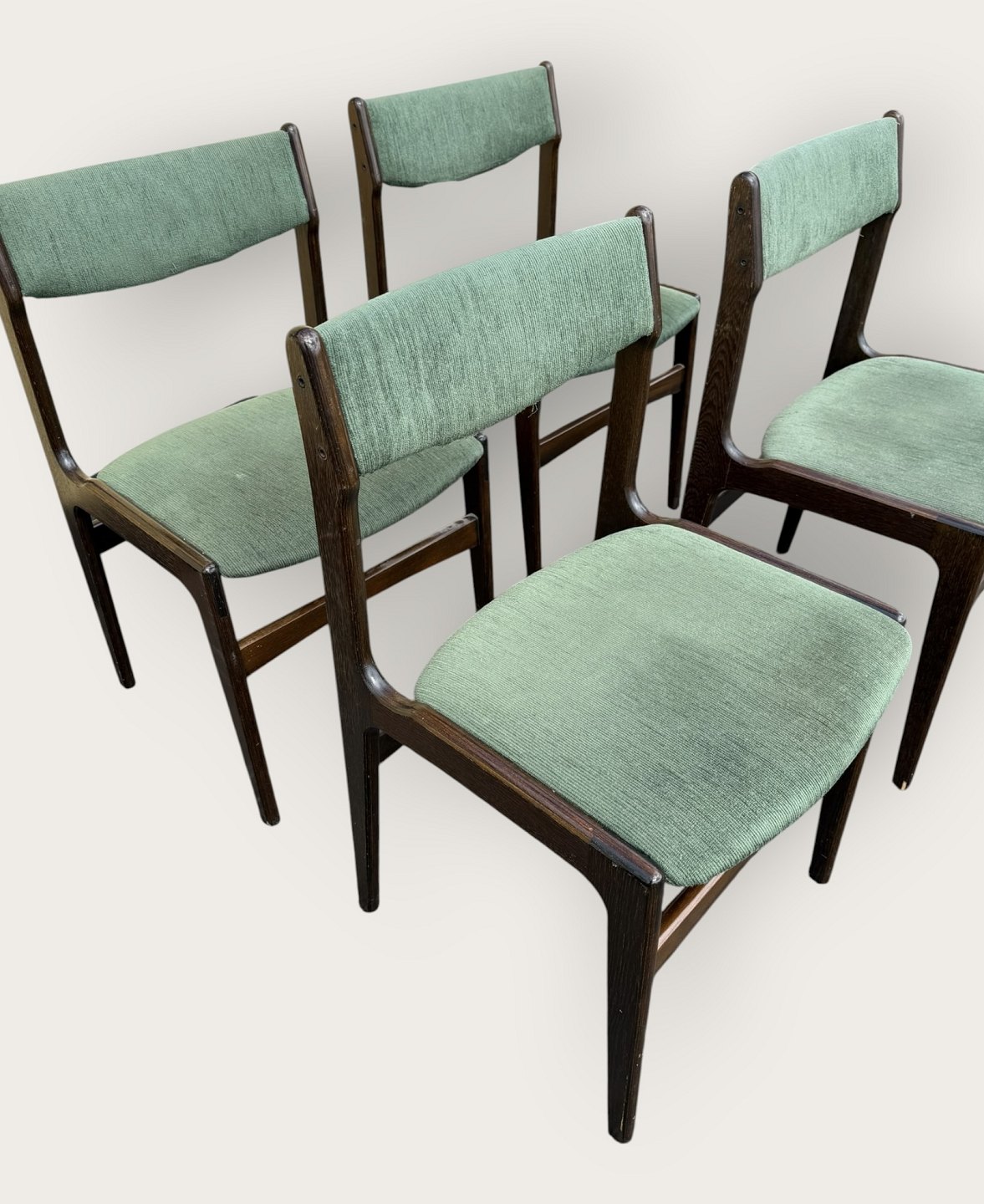 4 chairs in dark stained wood, Danish modern from the 1960s, the chairs are stable and in good used condition, but the cover is stained / loose.