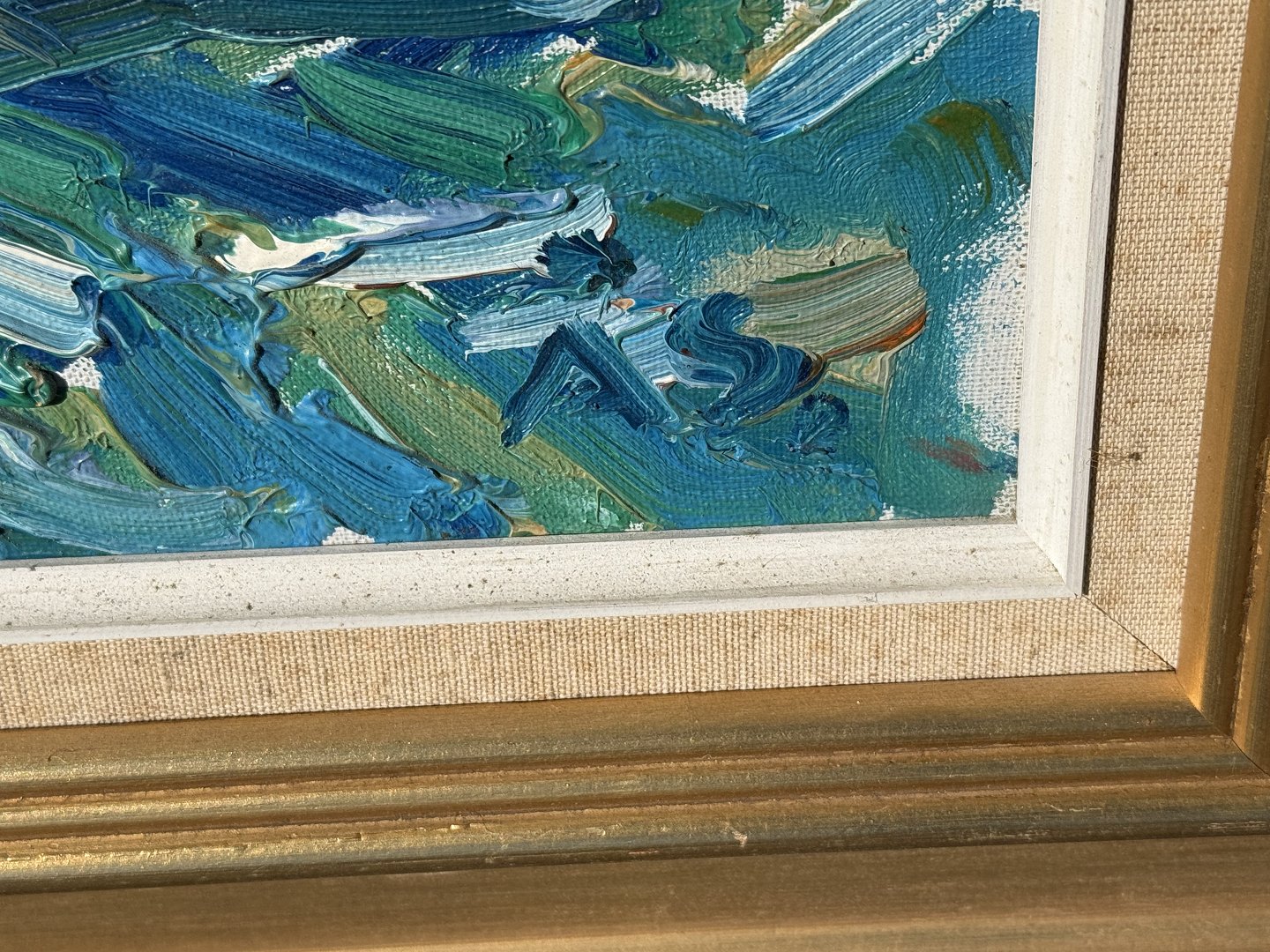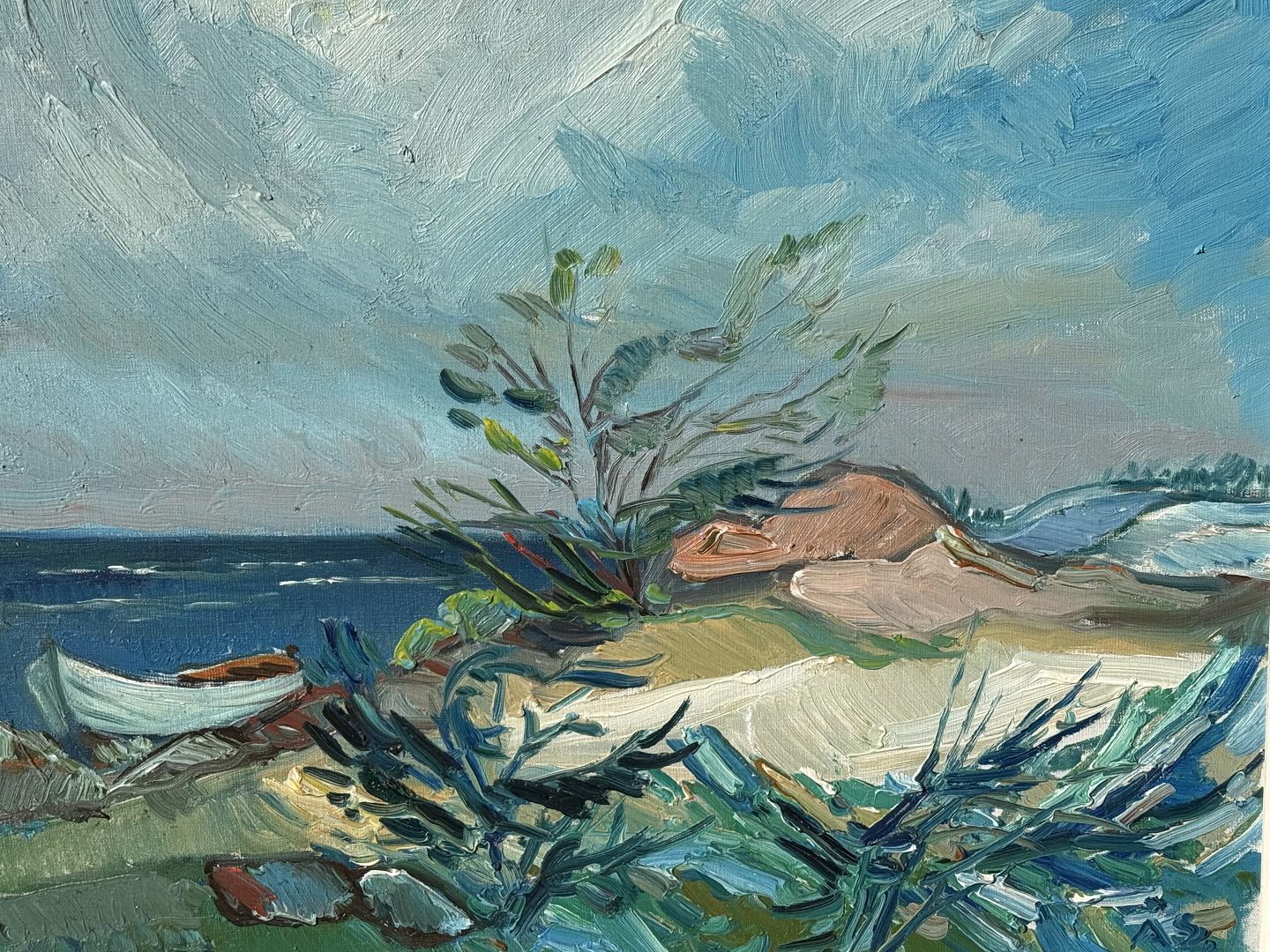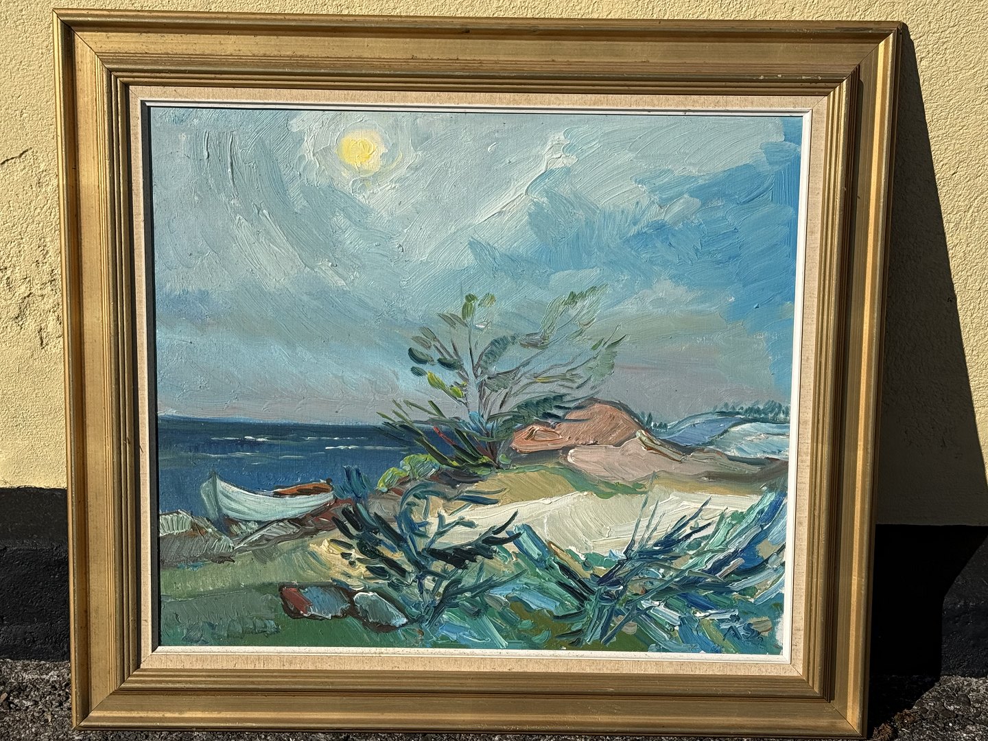 Aage Strand (1910-1975), oil painting on canvas, Boat by the beach, Signed Å.S., dimensions with frame 88x78cm *Good condition*