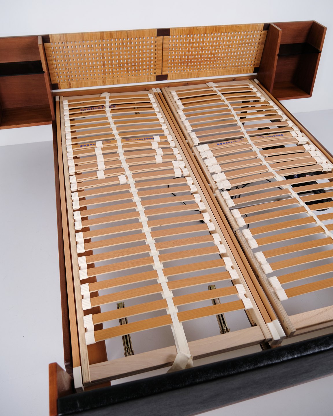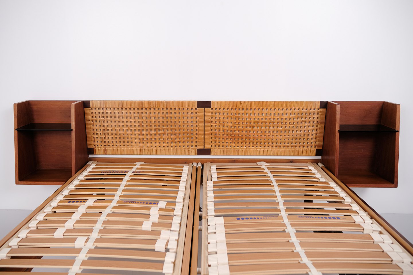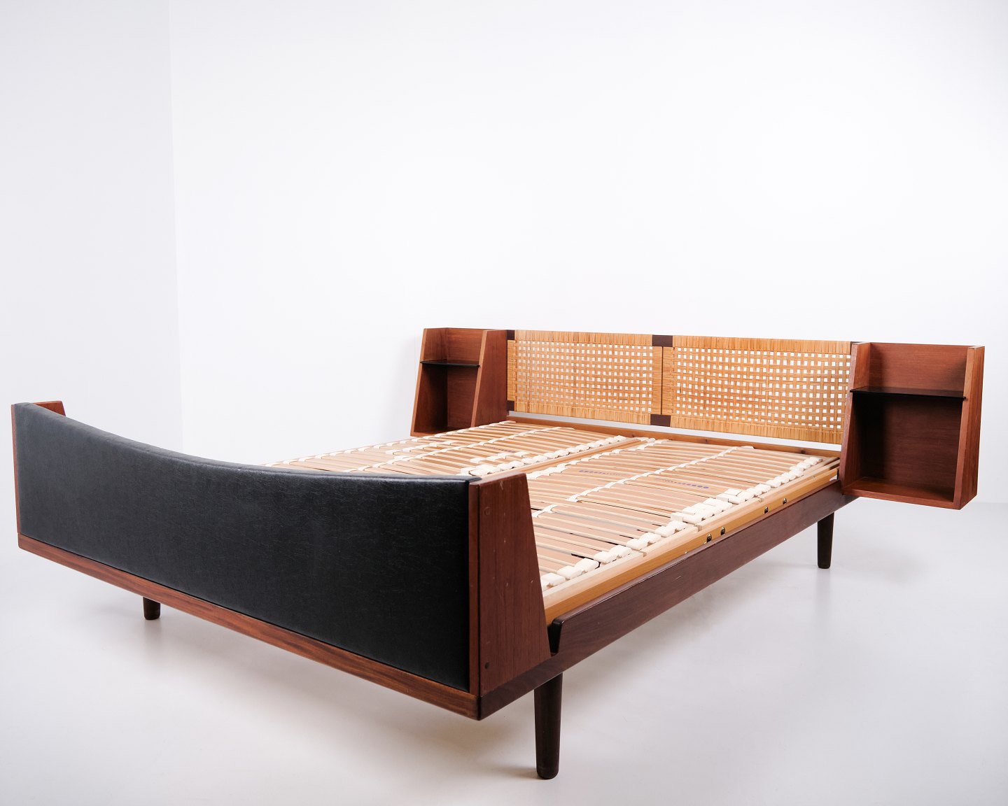 Model GE 701 double bed designed by Hans J. Wegner and manufactured by Getama in the 1950s. Crafted in veneered and solid teak. Headboard and footboard with cane weaving and black faux leather. Headboard with integrated bedside tables featuring black glass shelves and lower shelf. Brass fittings. Hans J. Wegner collaborated with Getama for many years and designed several teak furniture models for home interiors and bedrooms.