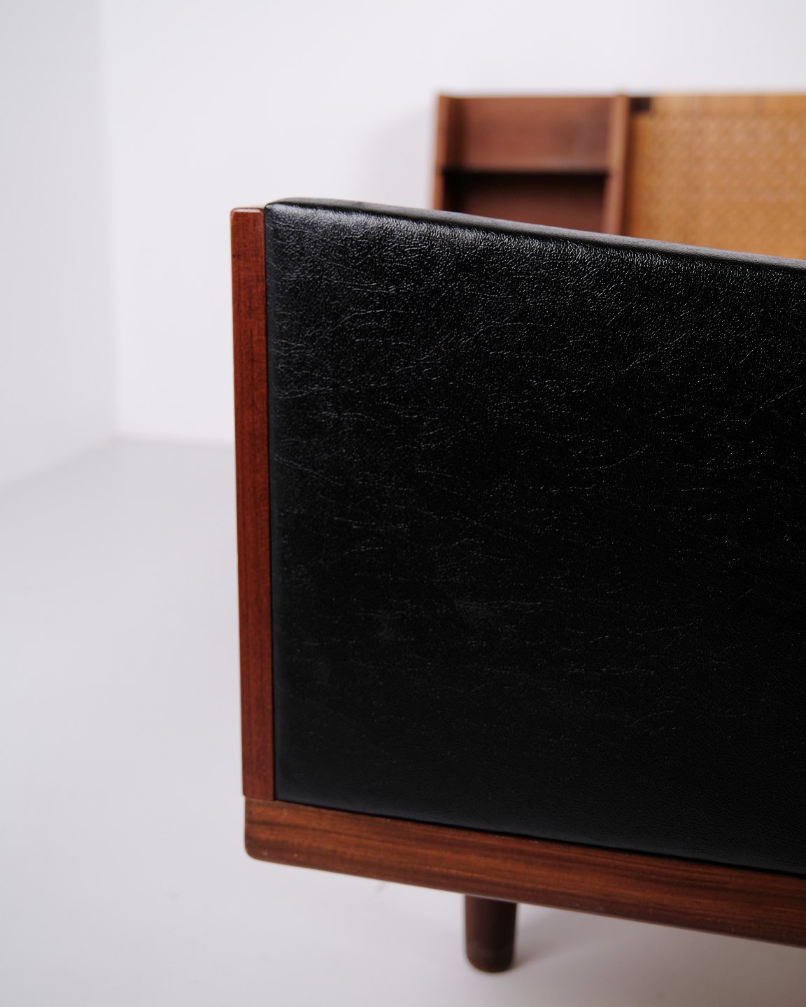 — Material: Veneered teak, solid teak, cane weaving, black faux leather and brass
