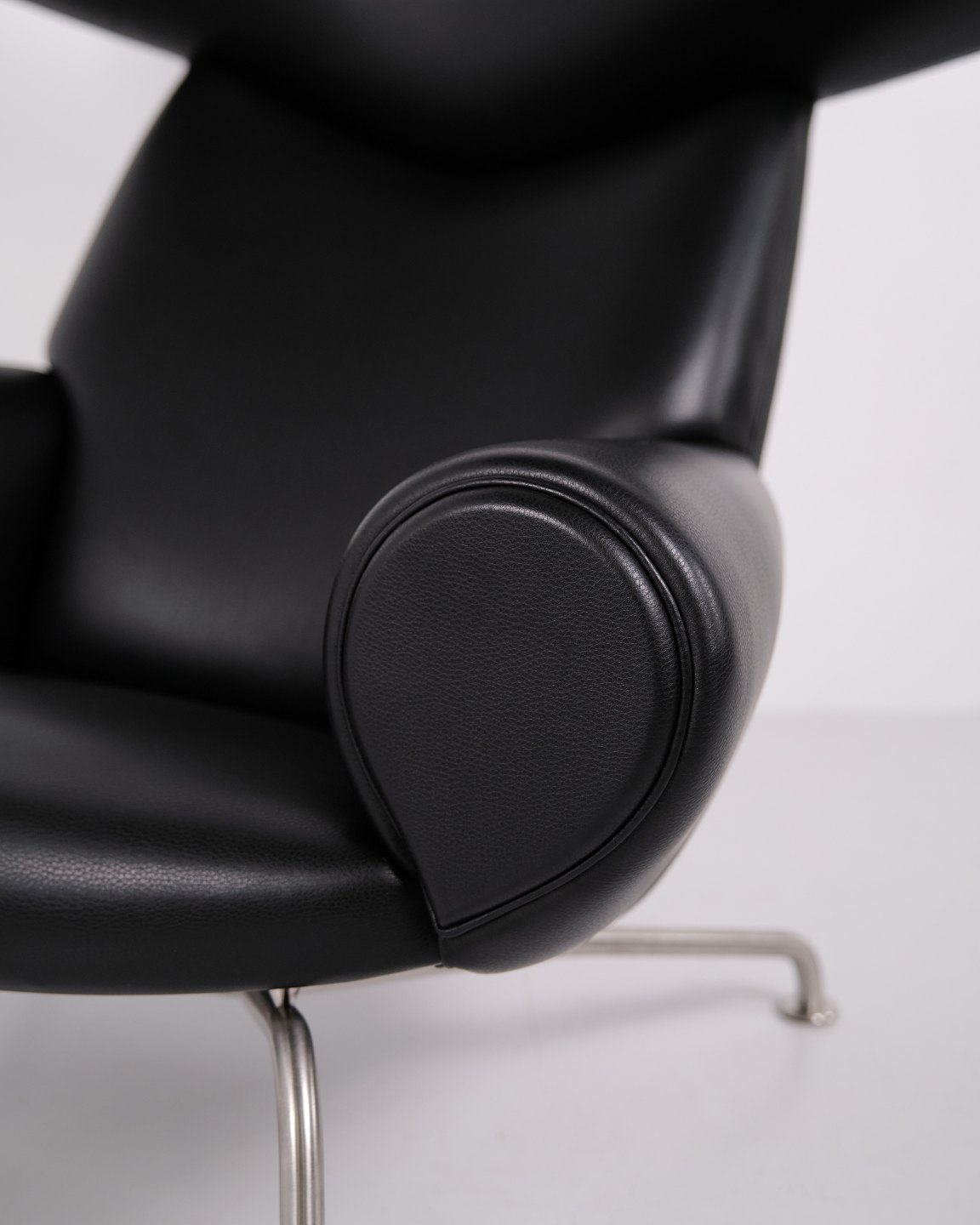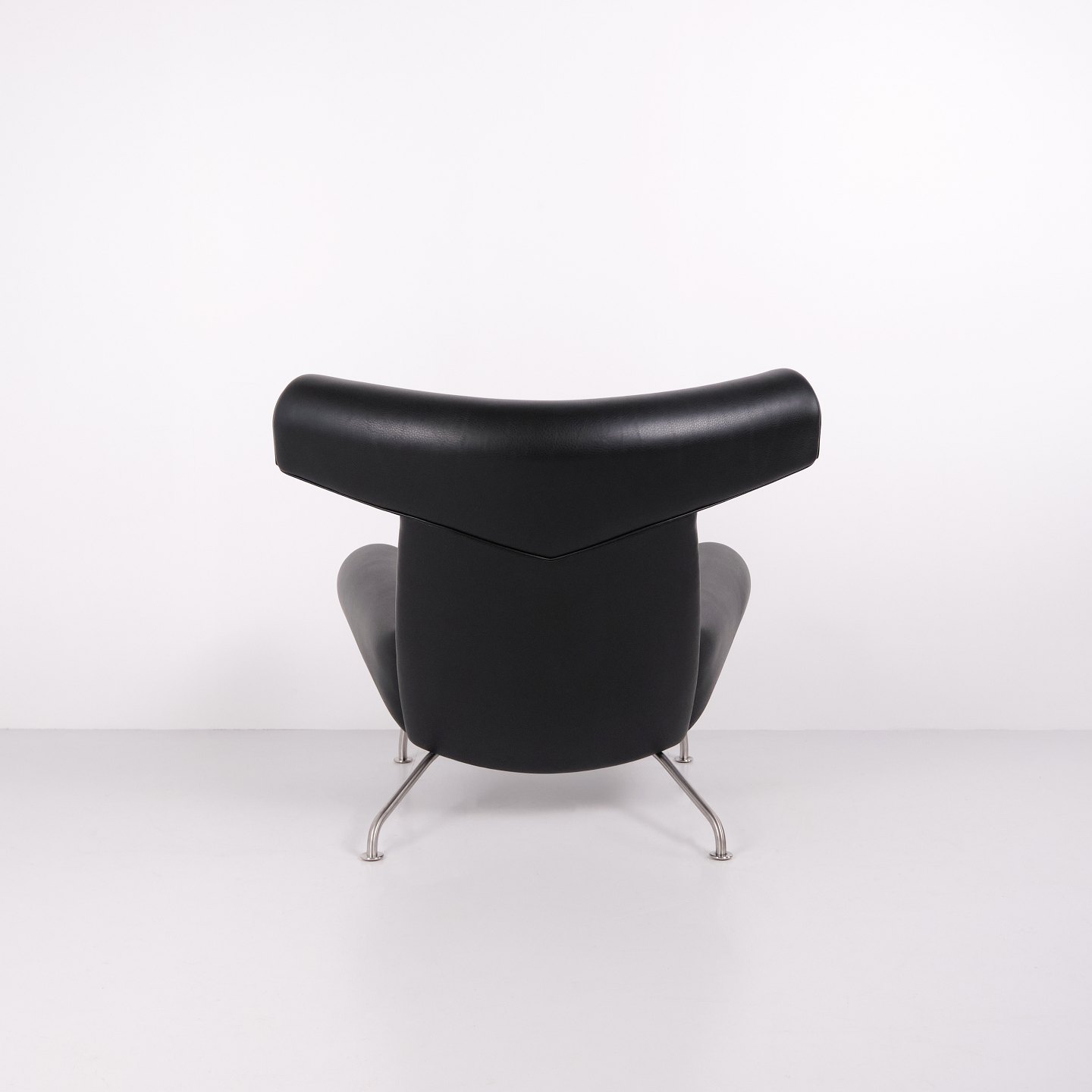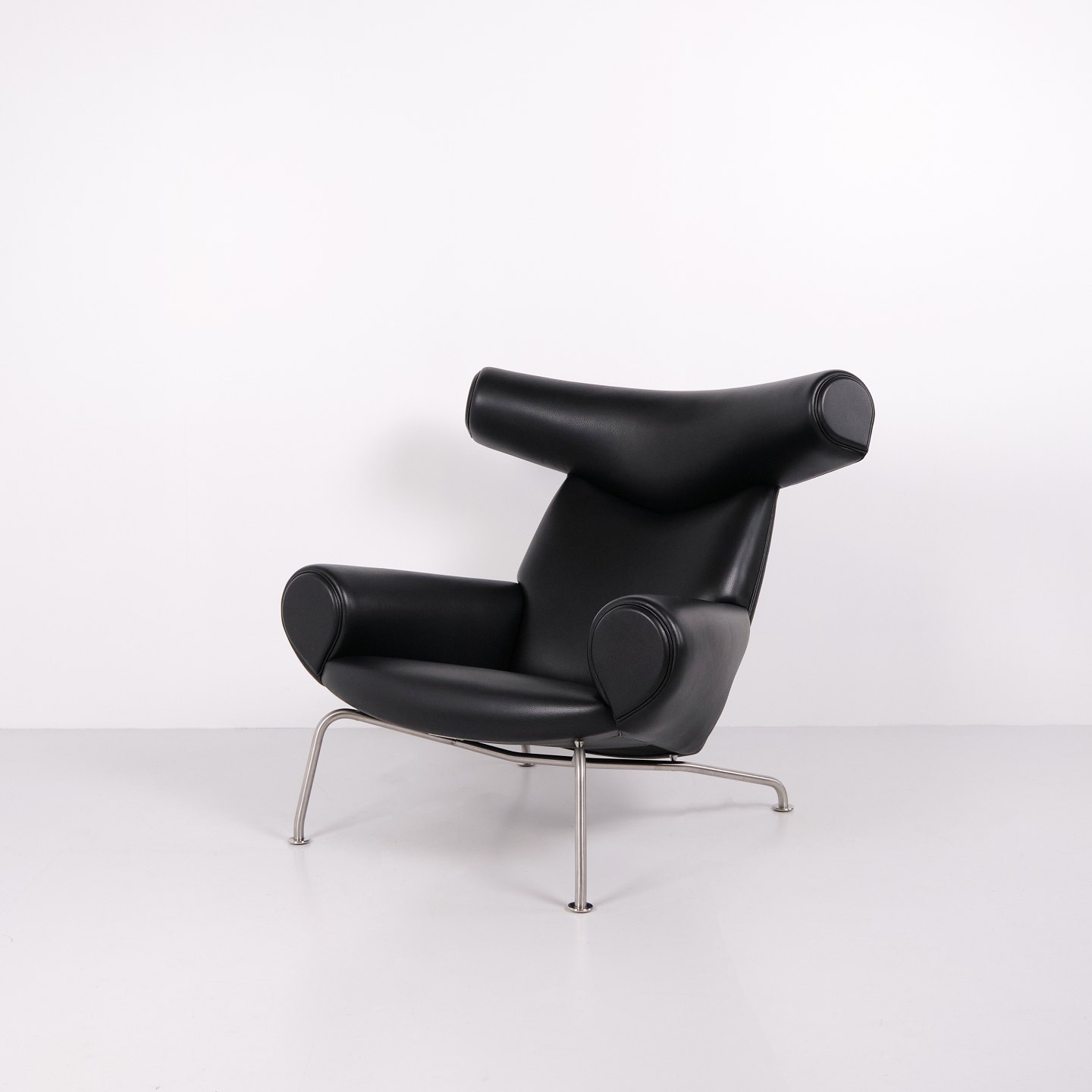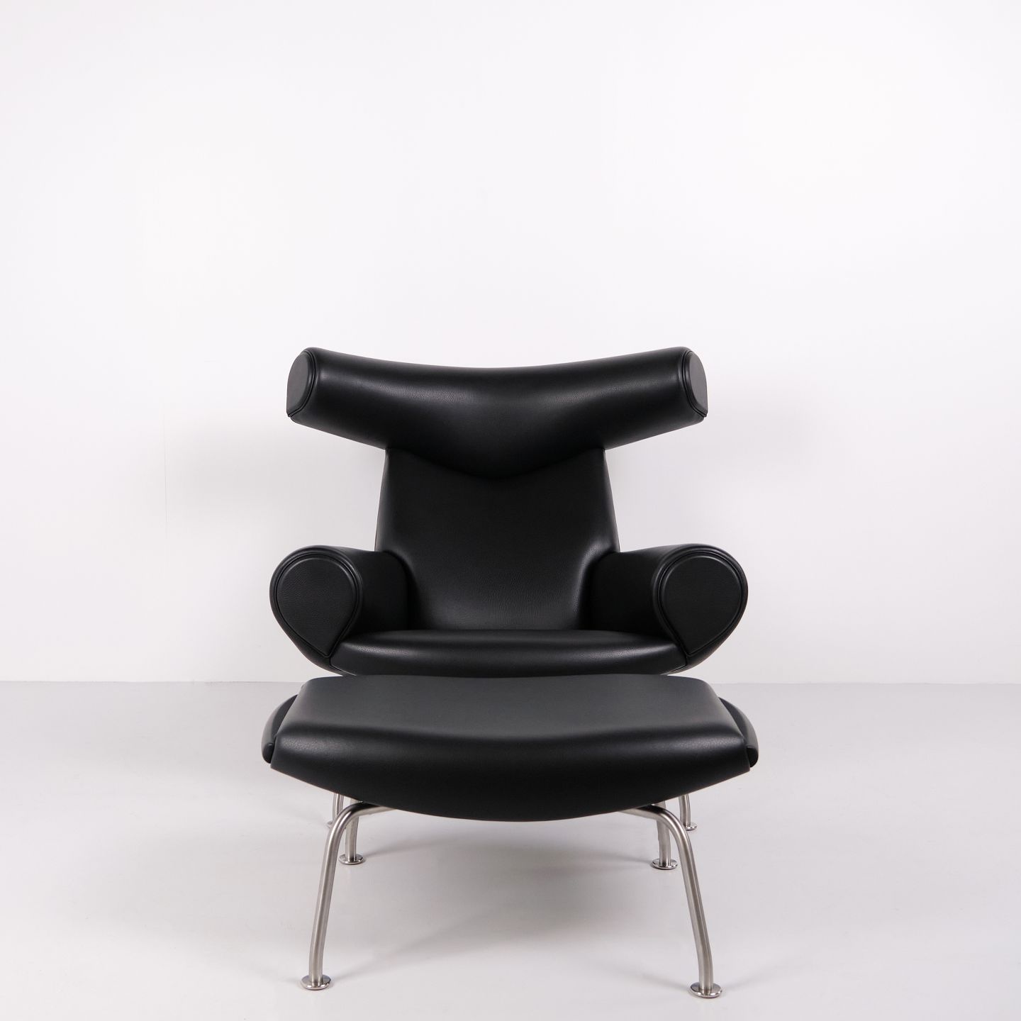 Ox Chair model EJ100 with matching ottoman designed by Hans J. Wegner. The model was designed in 1960 and is produced today by Fredericia Furniture following the acquisition of Erik Jørgensen. Upholstered in black leather with steel frame. The distinctive backrest with “horns” gave the chair its name Ox Chair. The design is considered one of Wegner’s most sculptural works and differs from many of his other chairs through its bold and organic form. The Ox Chair is represented in international collections and is among the most recognized Danish lounge chairs of the period.