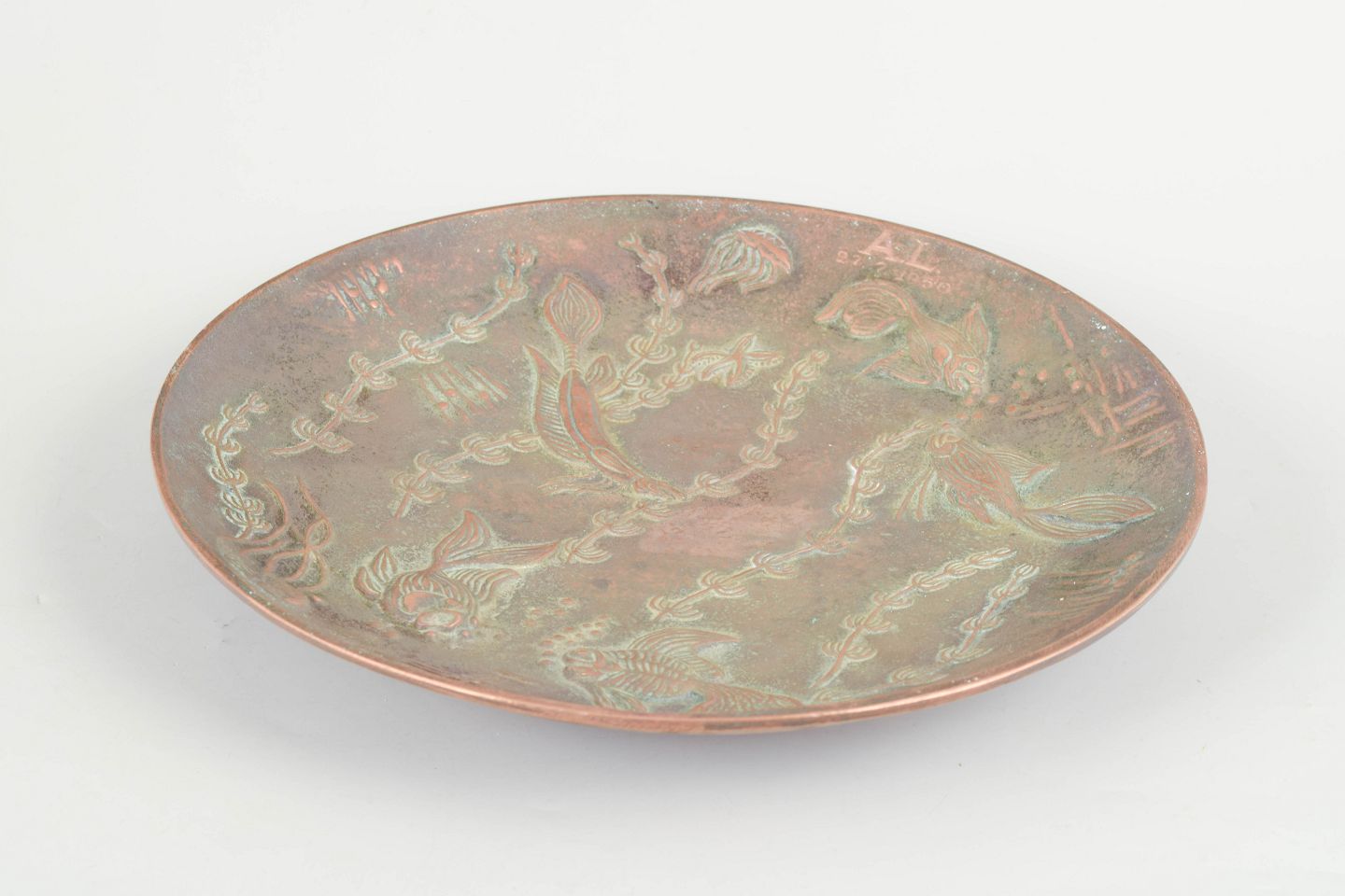 Rare circular bronze dish with relief decoration of stylised fish, aquatic plants and organic forms, executed with a characteristic patinated surface in warm copper and green tones. With engraved initials from a previous owner.