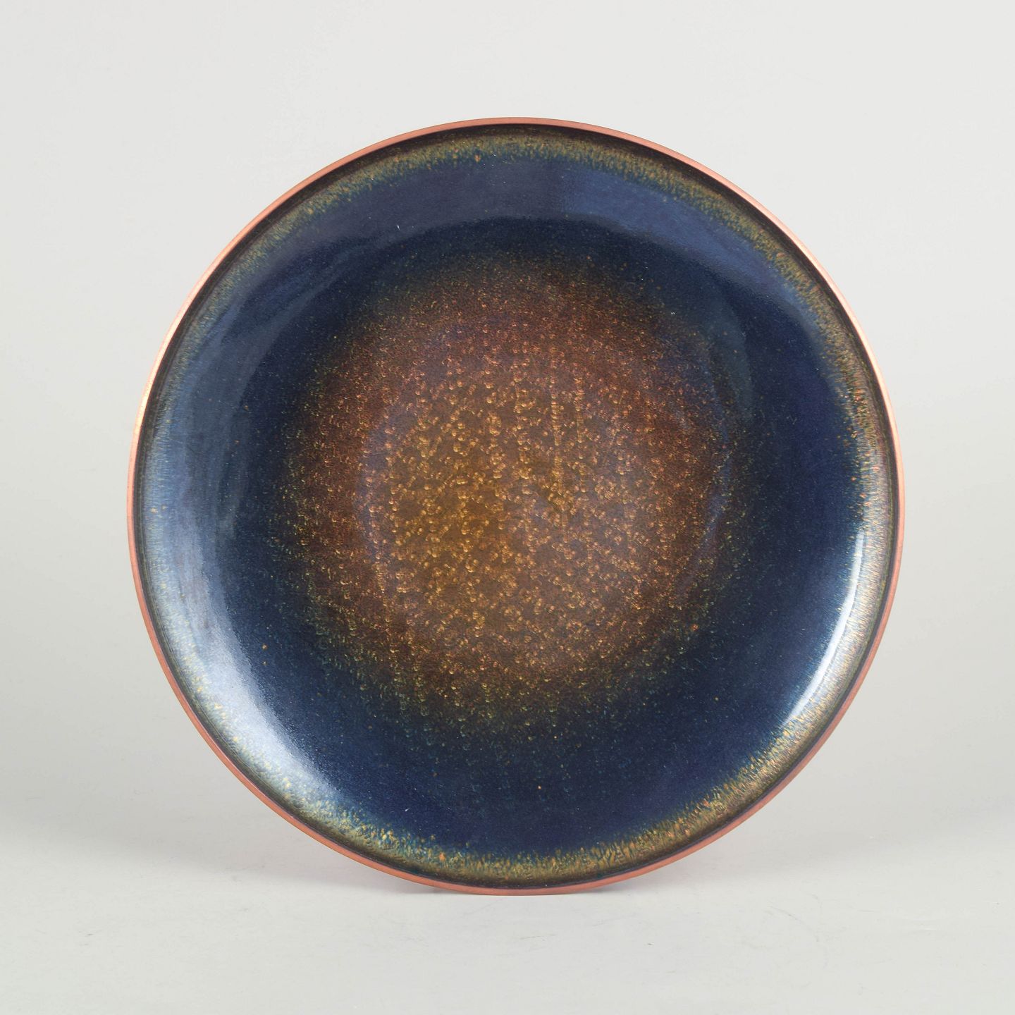 Handmade dish in enamel on copper with a deep blue glaze and golden iridescent centre, characteristic of Scandinavian enamel work from the period. Marked on the base.