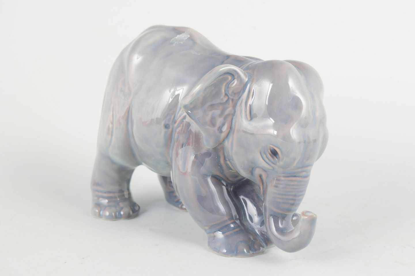 Naturalistically modelled elephant in porcelain model 2575 with a soft, iridescent glaze in grey and bluish tones. Finely detailed surface and marked as first factory quality on the base.