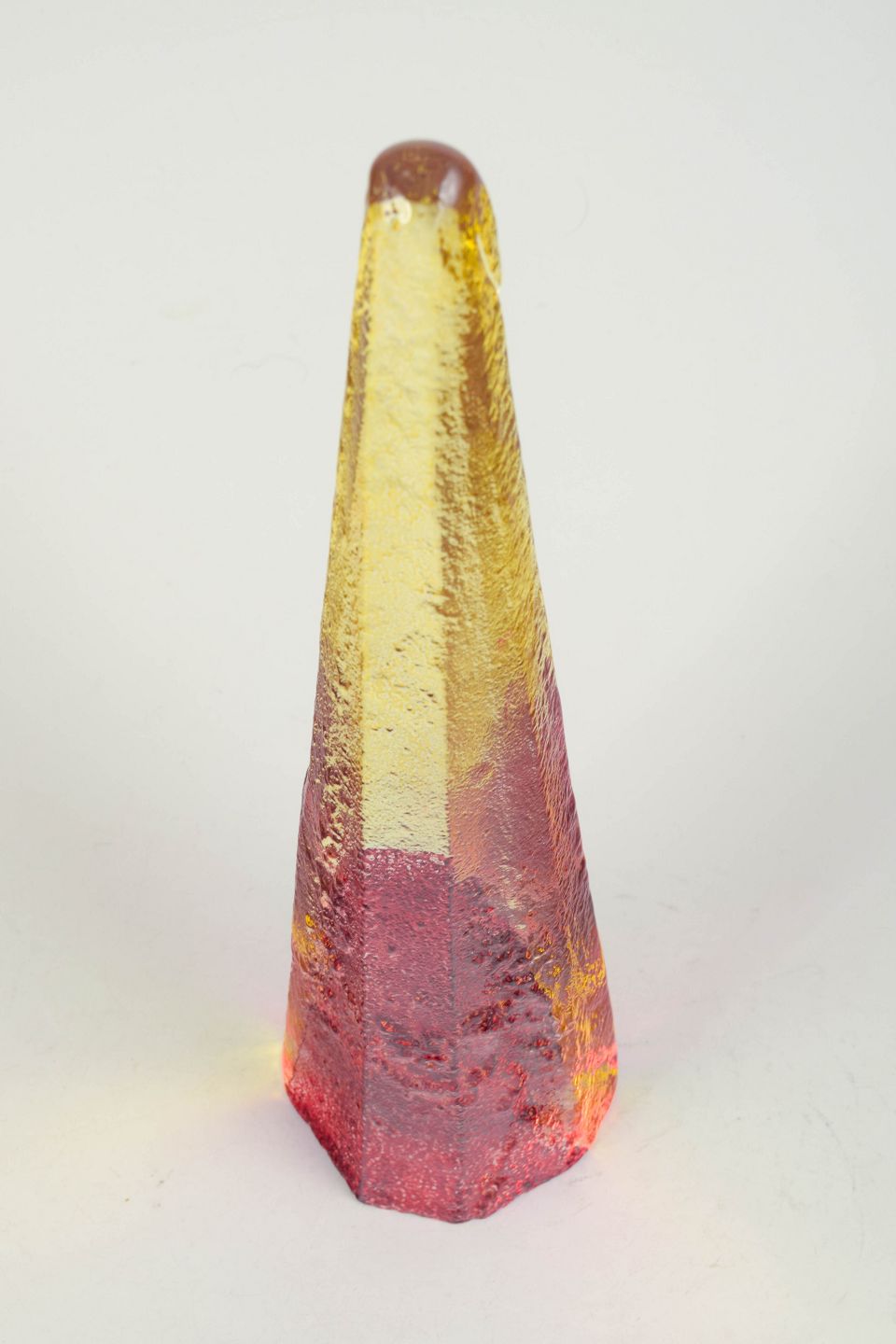 Tall conical sculptural form in mouth-blown glass with encased colours in yellow, red and clear tones. Signed Bergdala B. Hultqvist.