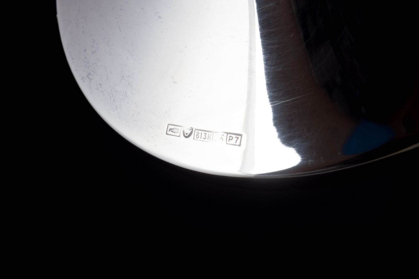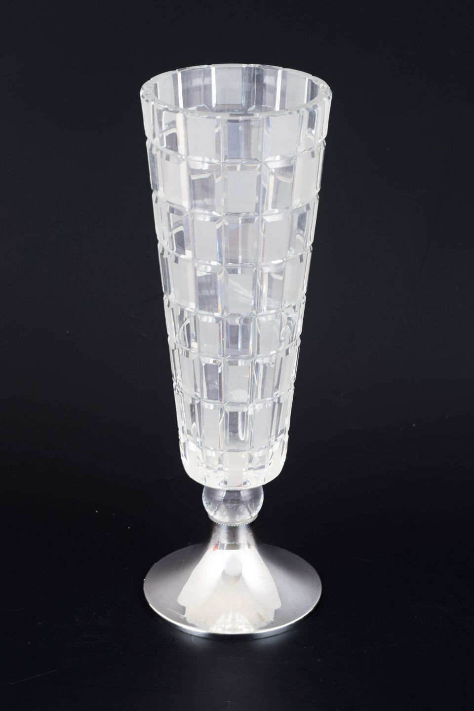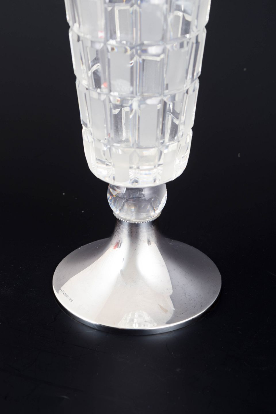 Modernist vase in cut crystal with a geometric pattern and base in 813 silver. The design features a clear, architectural structure characteristic of Finnish glass design of the period.