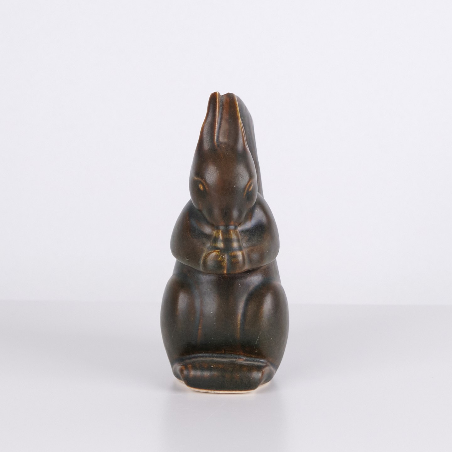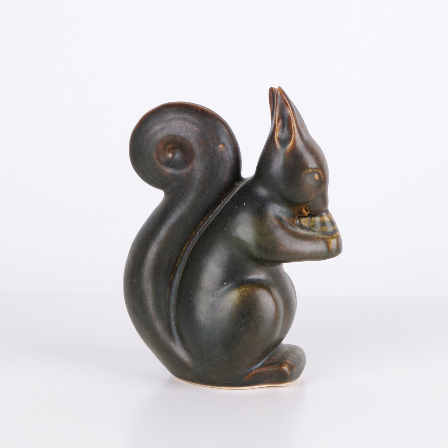 Ceramic squirrel figure by Knud Basse made in dark glaze with warm brown tones. The figure depicts a seated squirrel with nut and features marked organic lines characteristic of Danish studio pottery from the period. Knud Basse figures are known collector’s items within Danish animal ceramics.