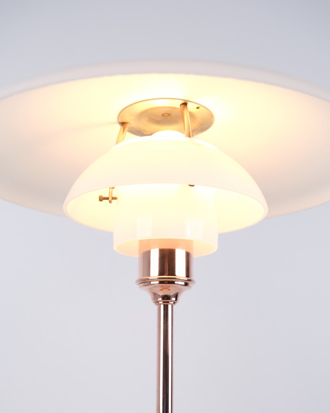 PH table lamp model PH 3½-2½ Limited Edition designed by Poul Henningsen and manufactured by Louis Poulsen. The lamp is made of copper with top shade in white opal glass and two lower shades in white opal glass. The model was sold for a limited period in 2015.