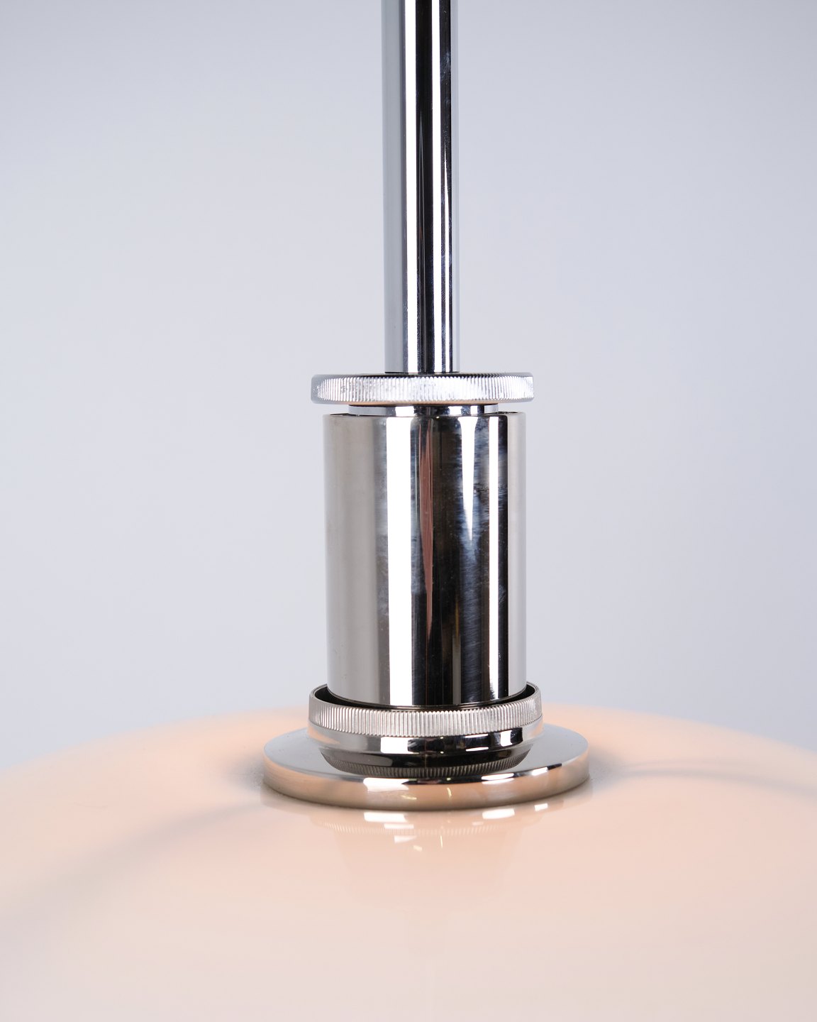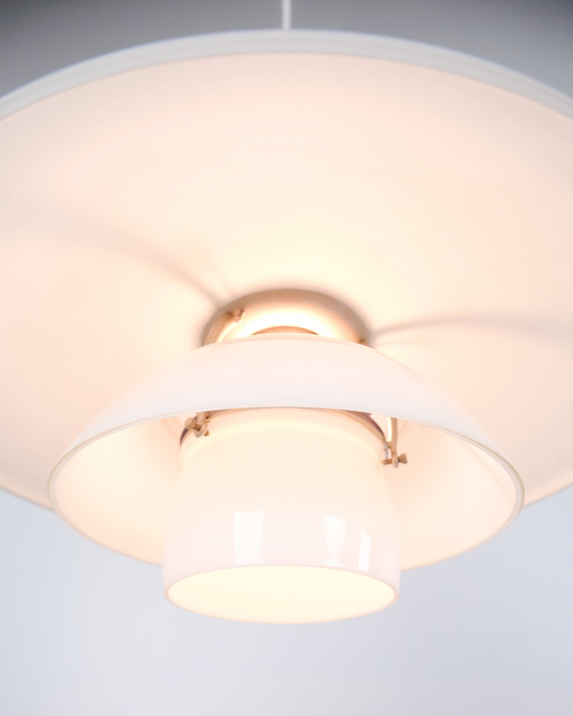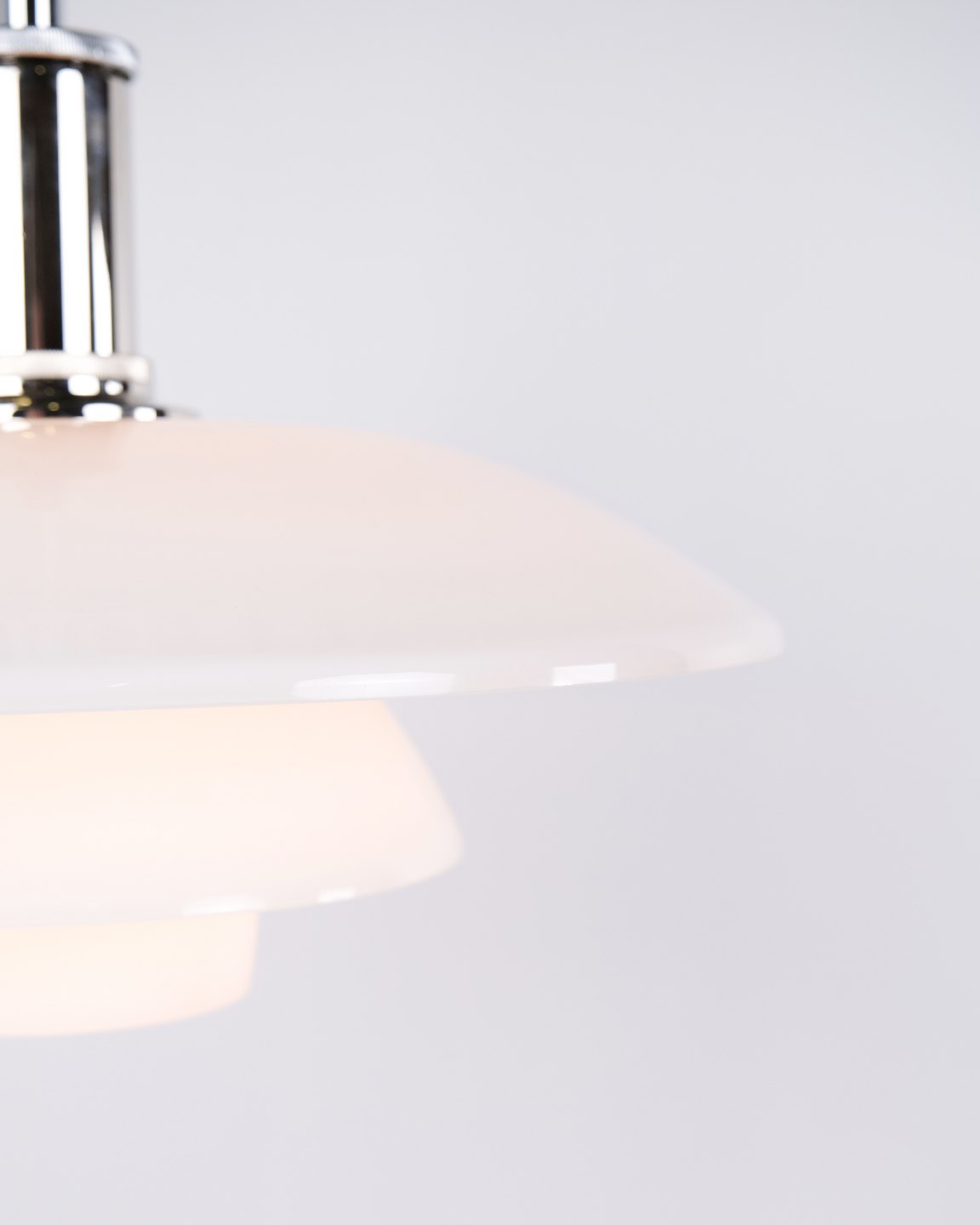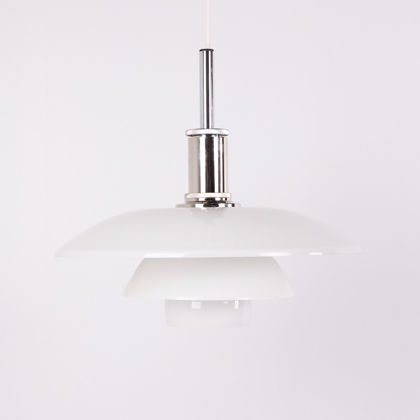 PH 4½-4 pendant designed by Poul Henningsen for Louis Poulsen. The lamp is made with hand-blown three-shade screens in white opal glass and chrome suspension. The model has a top shade of approximately 45 cm and uses the lower shades from the PH 4/4 series, developed to provide wider light distribution when hung low above a dining table or tabletop. The current version was introduced in 1980 and is part of the iconic PH glare-free lighting system.