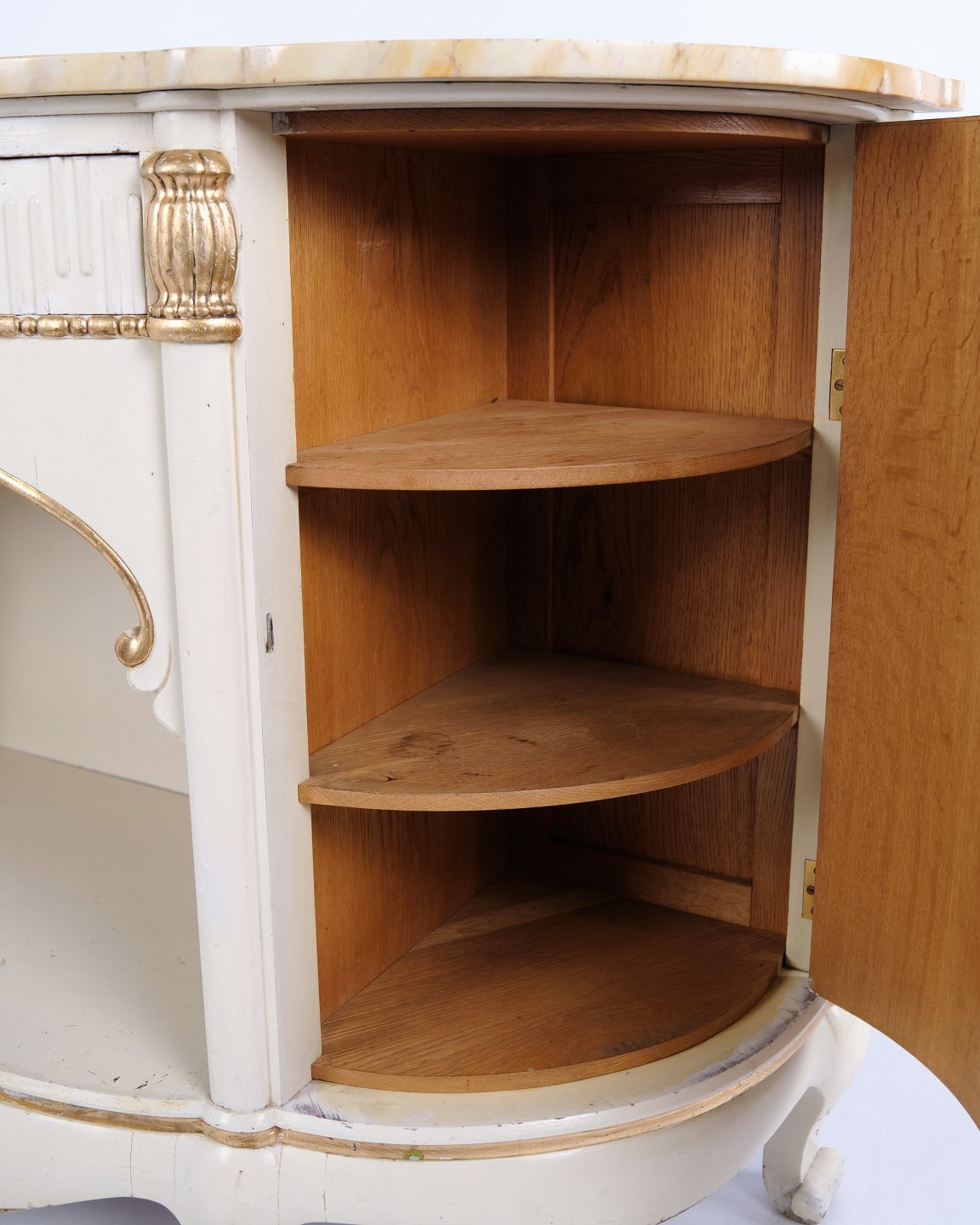 Curved sideboard produced by P. Svensen, N. Frihavnegade 15, Copenhagen. The piece is made of painted wood with profiled details, gilt decorations and original marble top. The front features an open central niche, small drawer and two curved cabinets with interior shelves. Classic Empire-inspired form with curved sides, shaped legs and decorative fittings. Suitable as an entrance hall piece, console or storage sideboard.