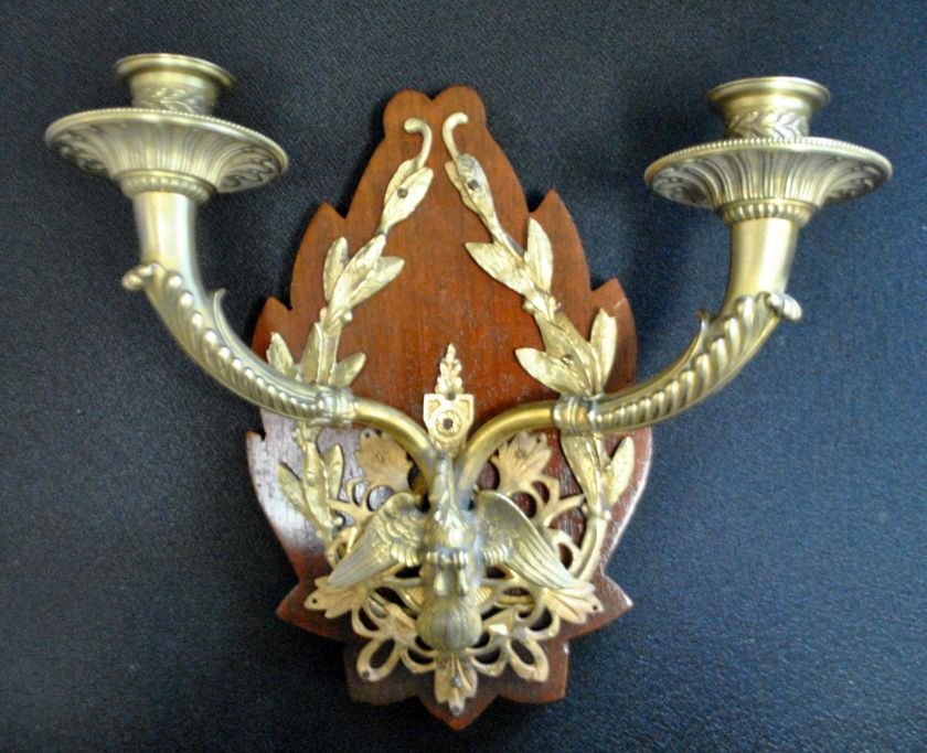 Pair of French bronze double wall sconces, mounted on wood, 19th century. Decoration in the form of swans with spread wings. H. 23 cm. W. 27.5 cm.