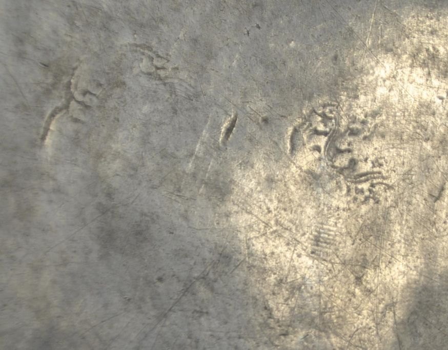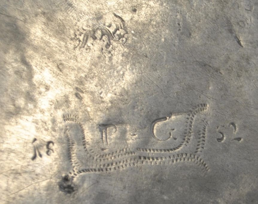 Pewter dish, 18th century. With stamps and engravings. Engraving on the front: PH.M and floral decoration. On the underside: P. G 1832. Unclear master stamps. Diameter: 29 cm.