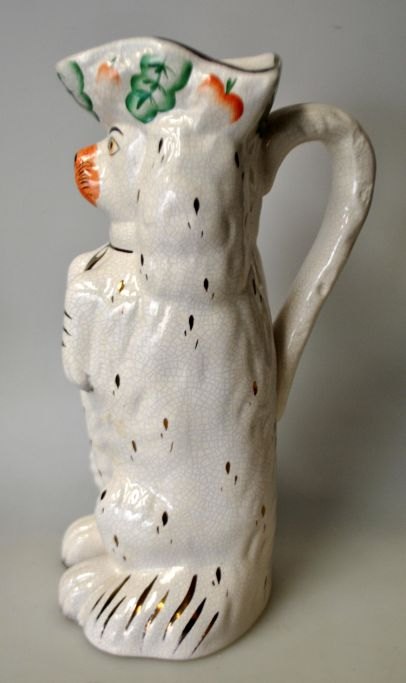 Staffordshire dog jug, 19th century England. Faience with hand-painted details. H.: 25.5 cm.