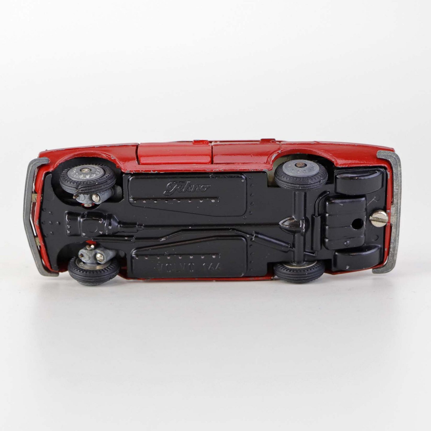 Sedan legetøjsbil i rødlakeret metal med gummi hjul. Model Volvo 144