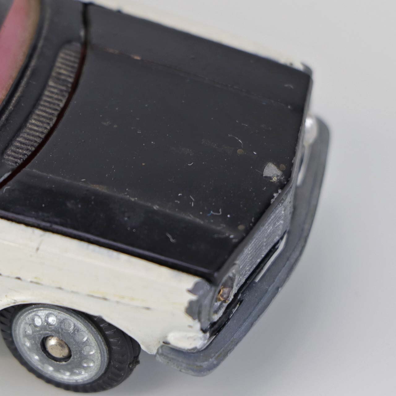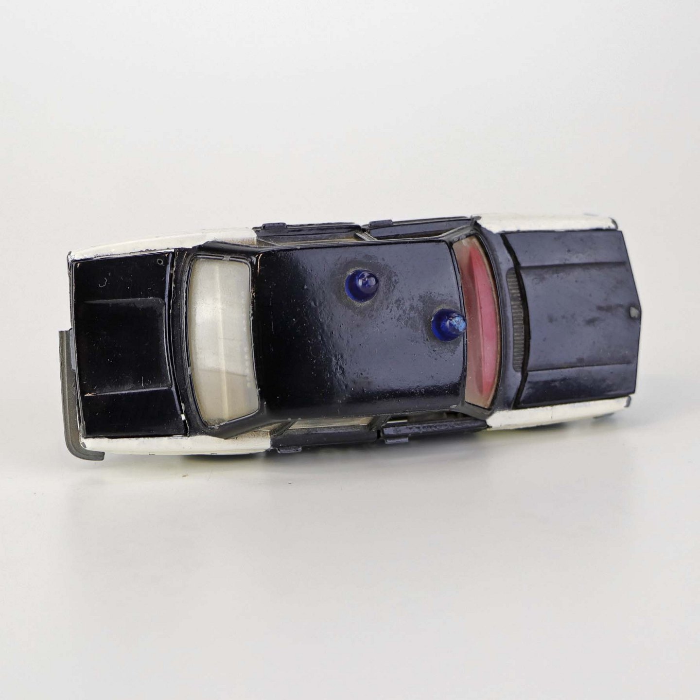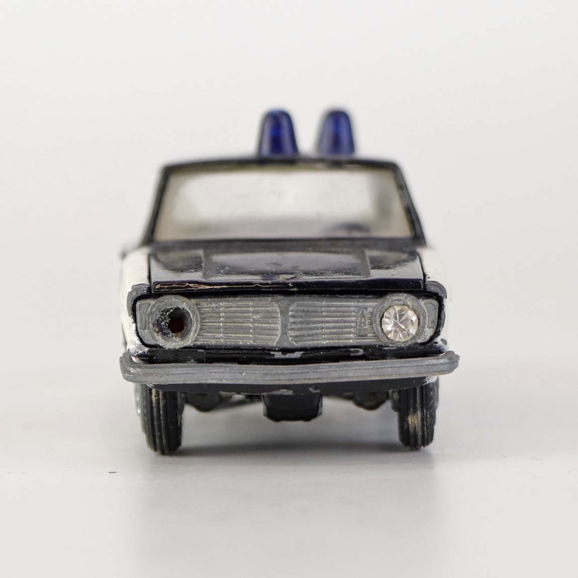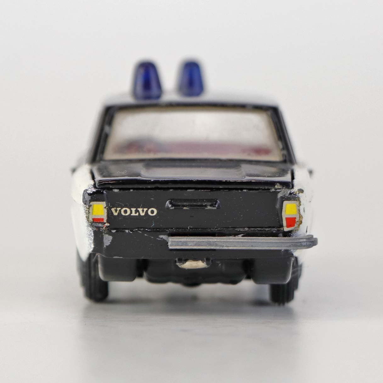 Politibil med to blinklys. Legetøjsbil i sortlakeret metal med gummi hjul og blå blinklys. Model Volvo 144