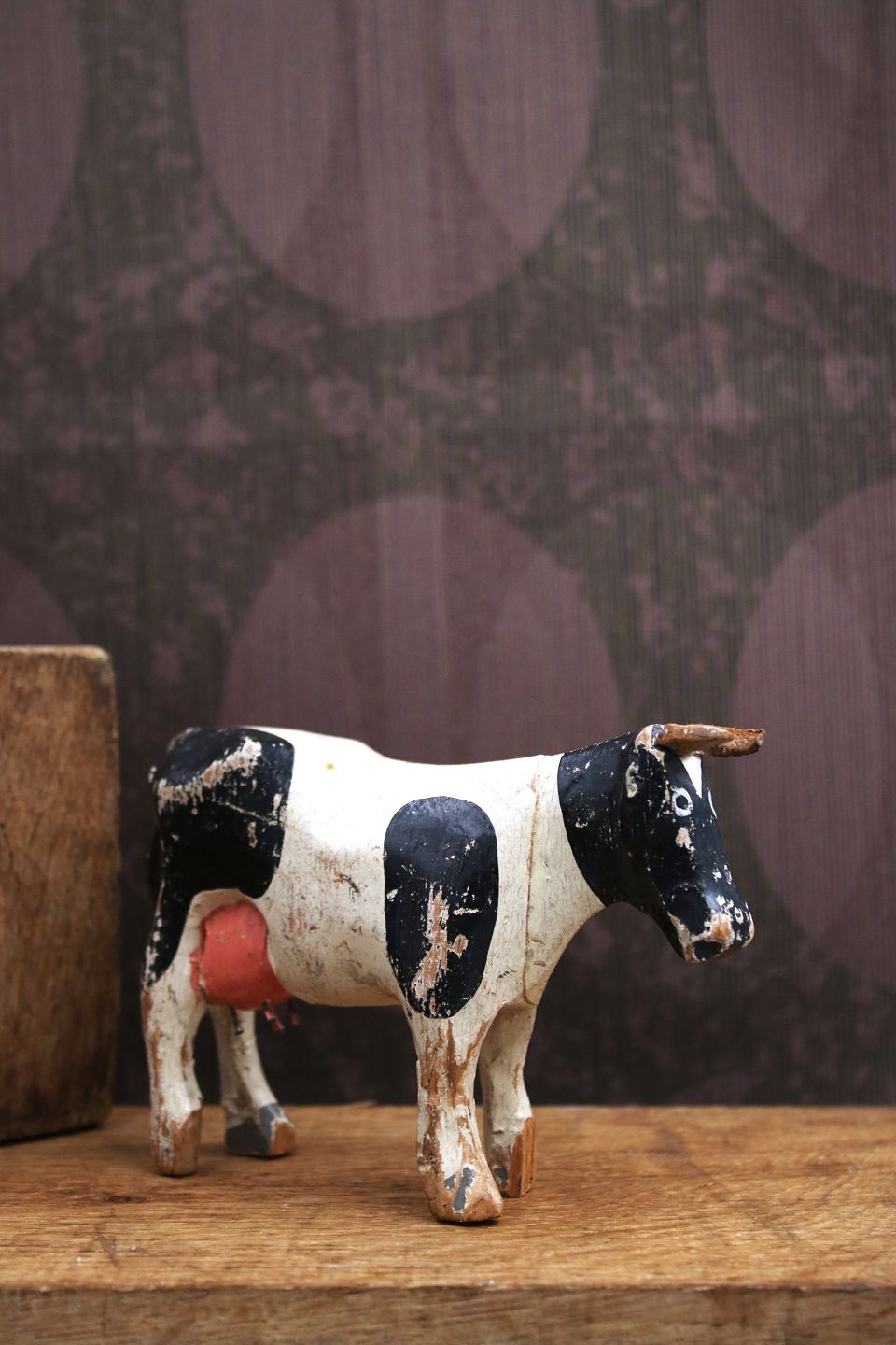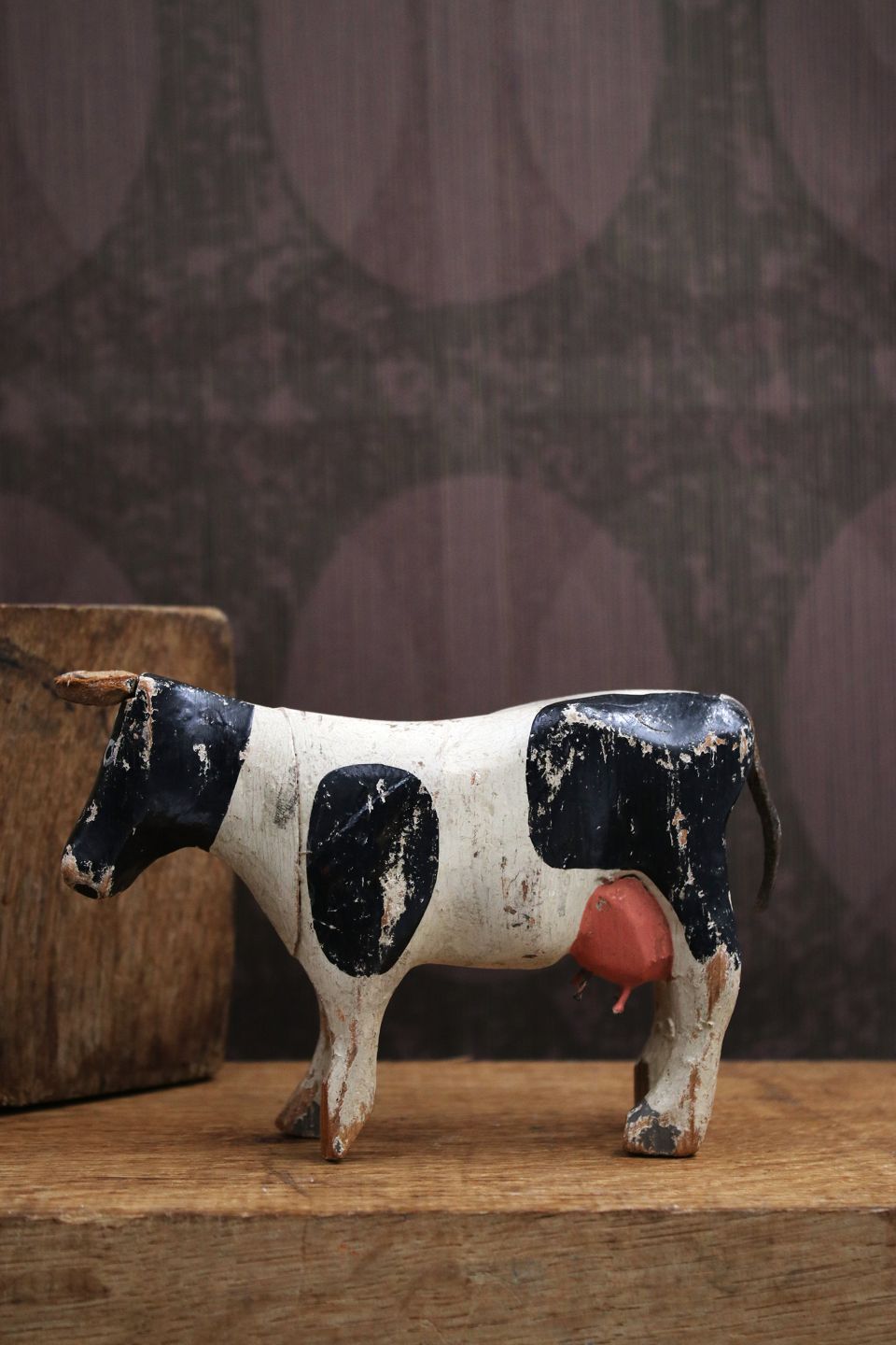 Decorative, old dairy cow in carved wood with fine original painting, horns and tail in leather...