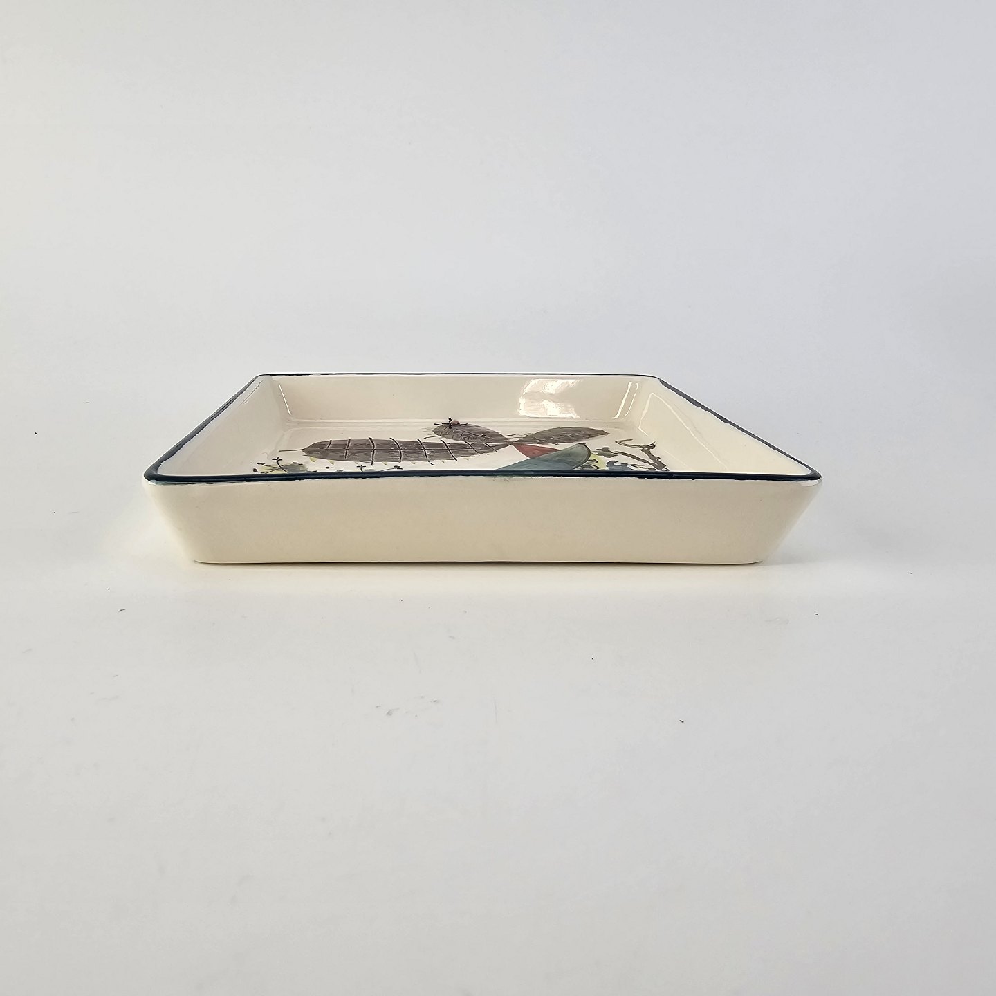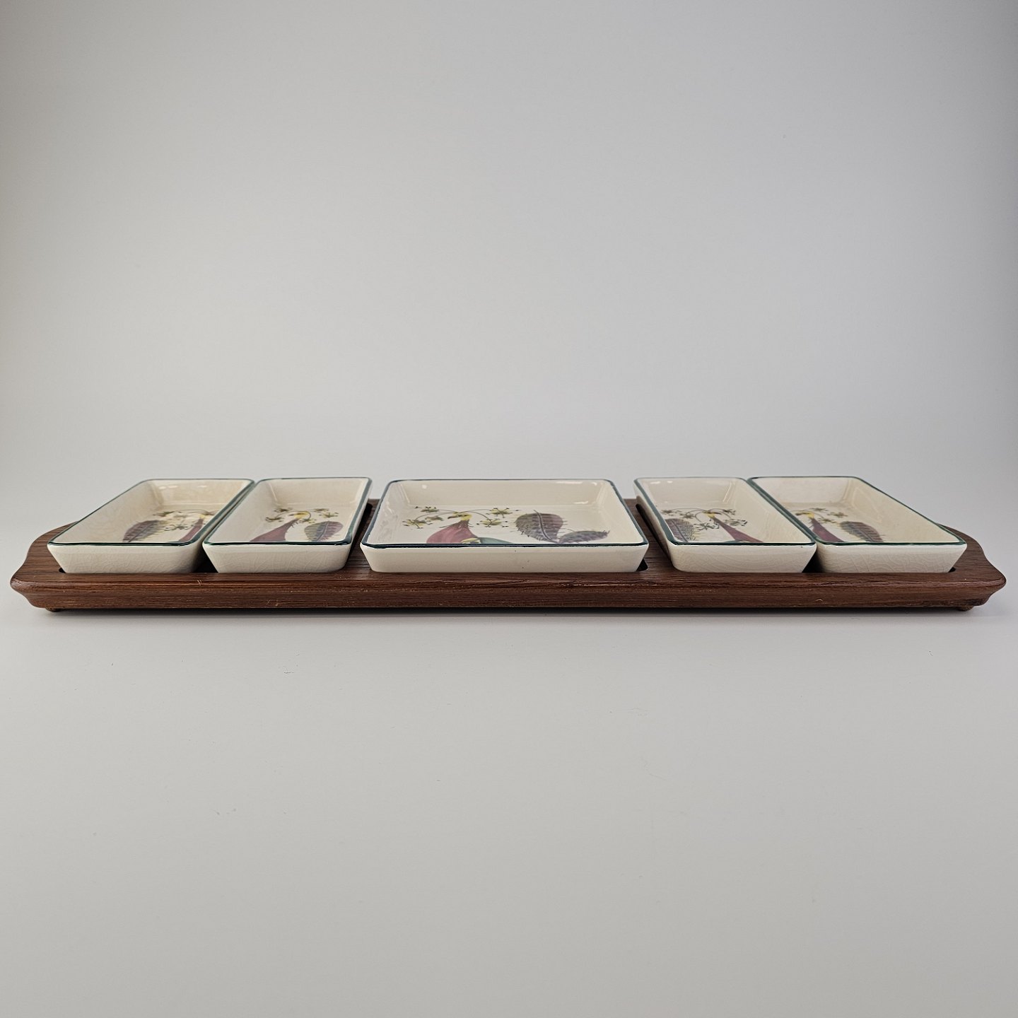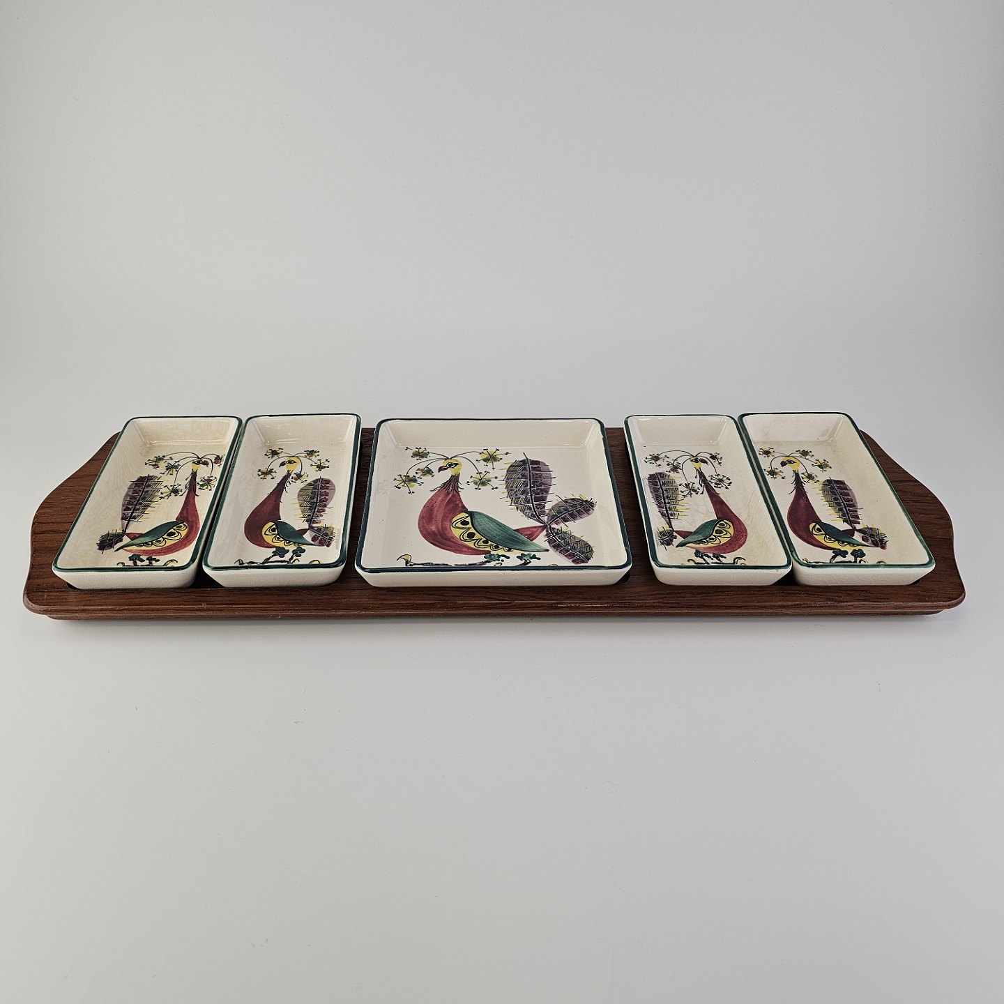 Text available in Danish: Cabaret fad fra serien Tenera med bakke i teak træ og fem små, firkantede fade i fajance med dekoration af påfugle