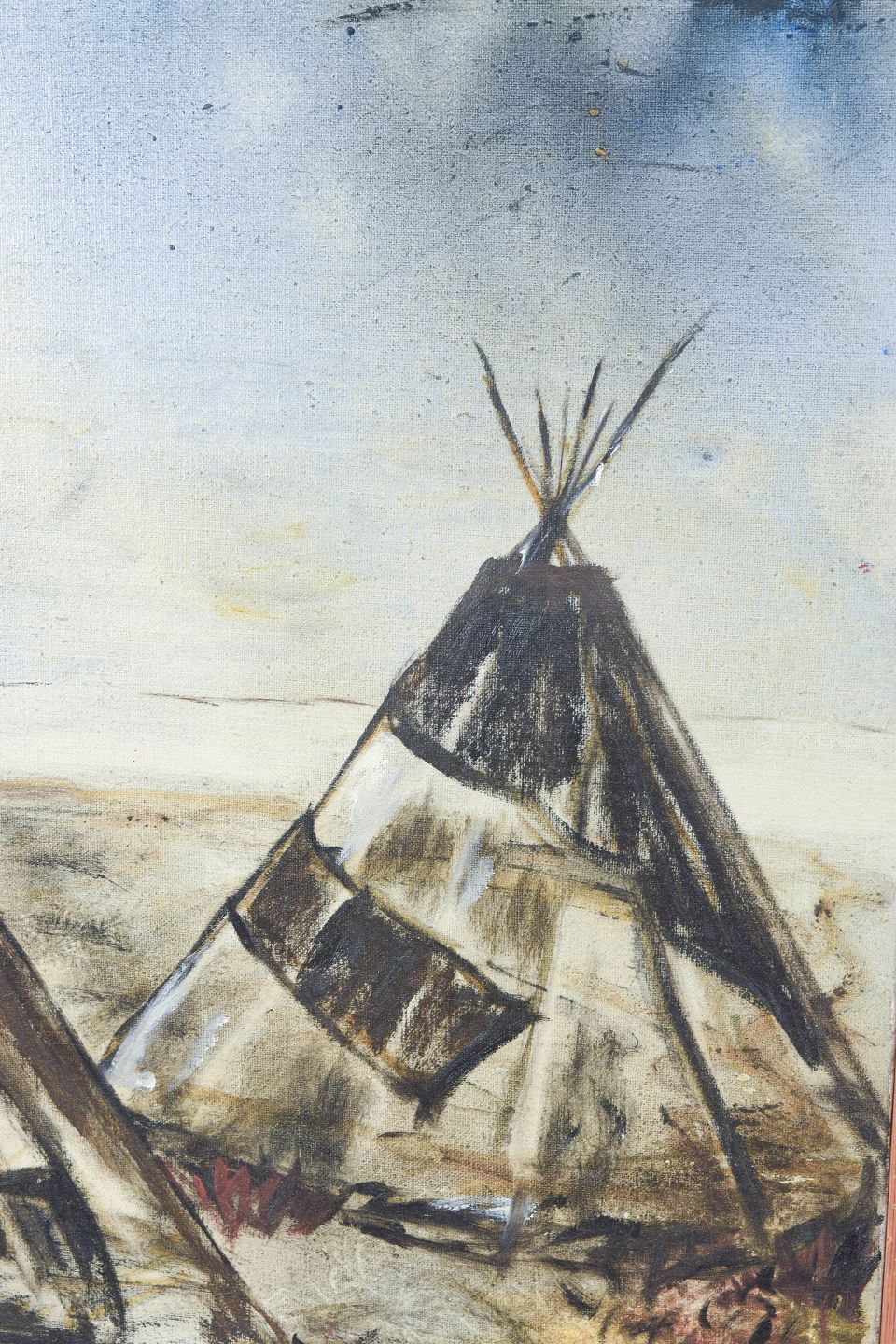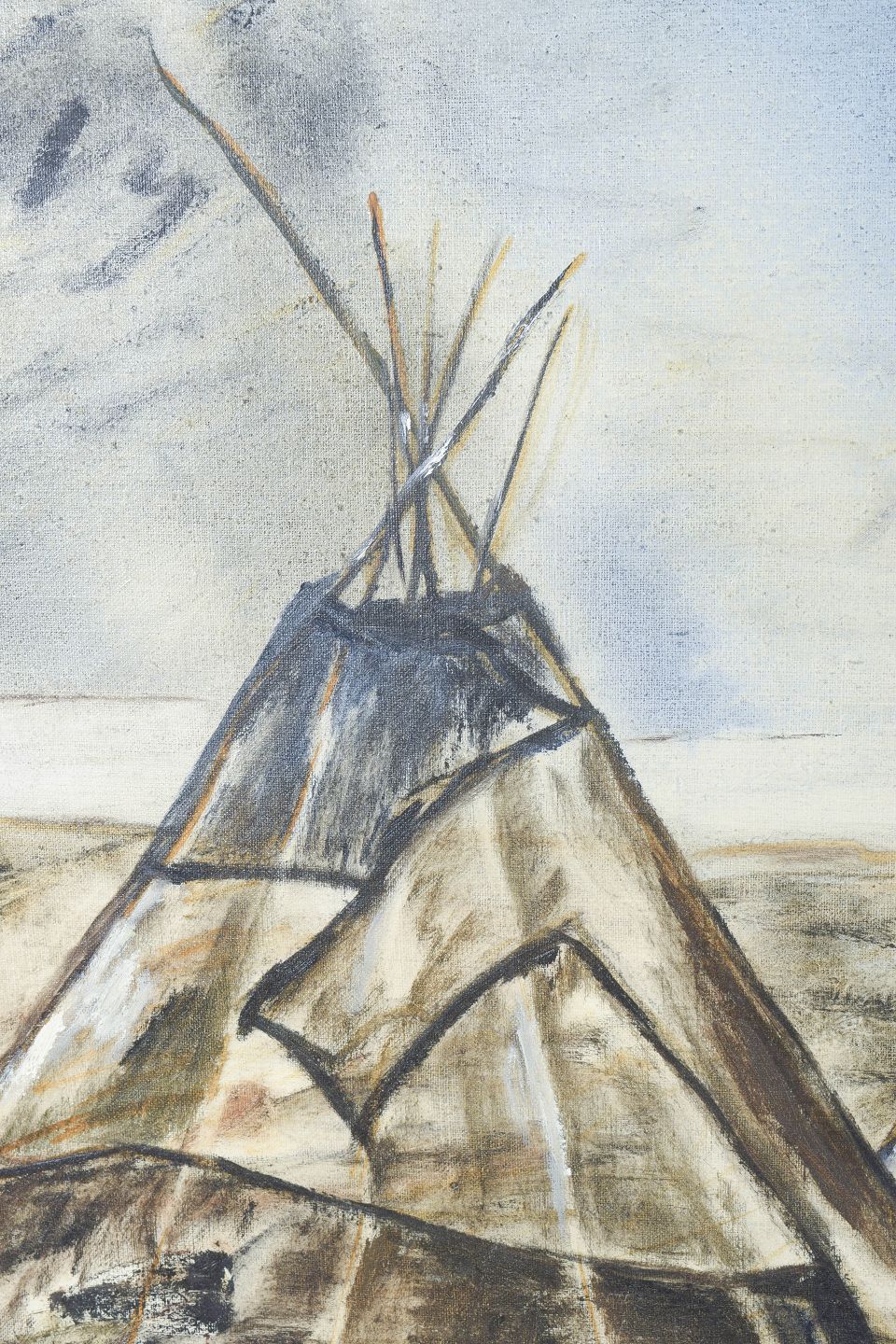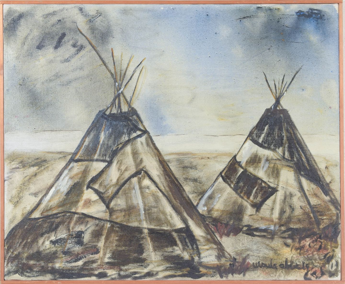 Modernist landscape motif from Lapland depicting Sámi tents in an expressive and slightly abstracted composition. Executed in subdued earthy tones with a free brushstroke, signed.