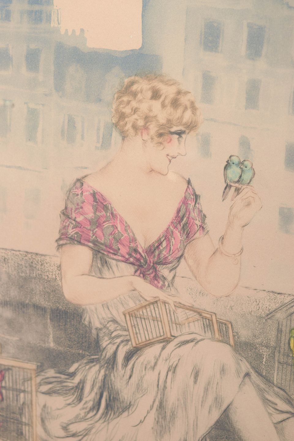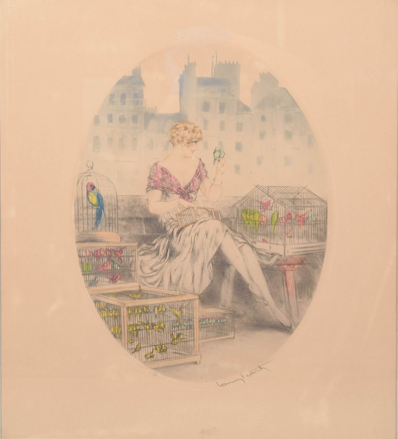 Louis Icart, etching, listed French artist. "Bird Seller"
