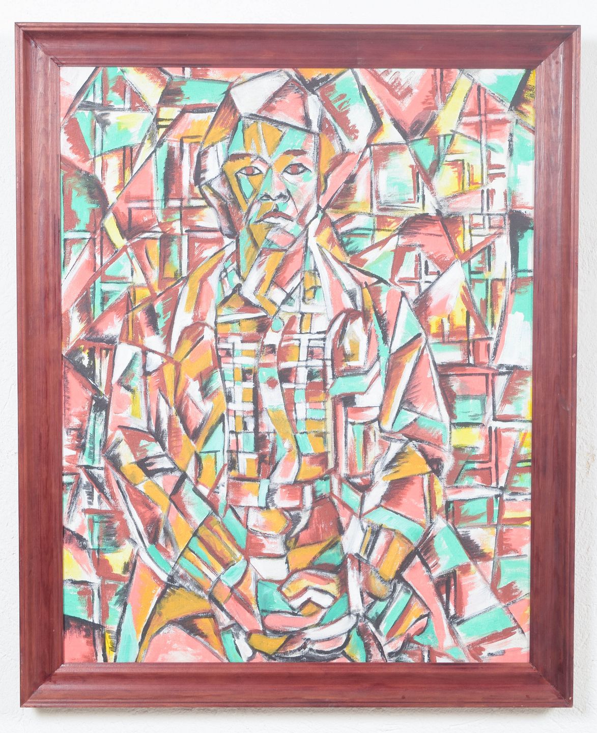 Colourful cubist-inspired figurative composition with a geometrically structured motif and expressive brushwork, executed in oil on canvas. Unsigned.