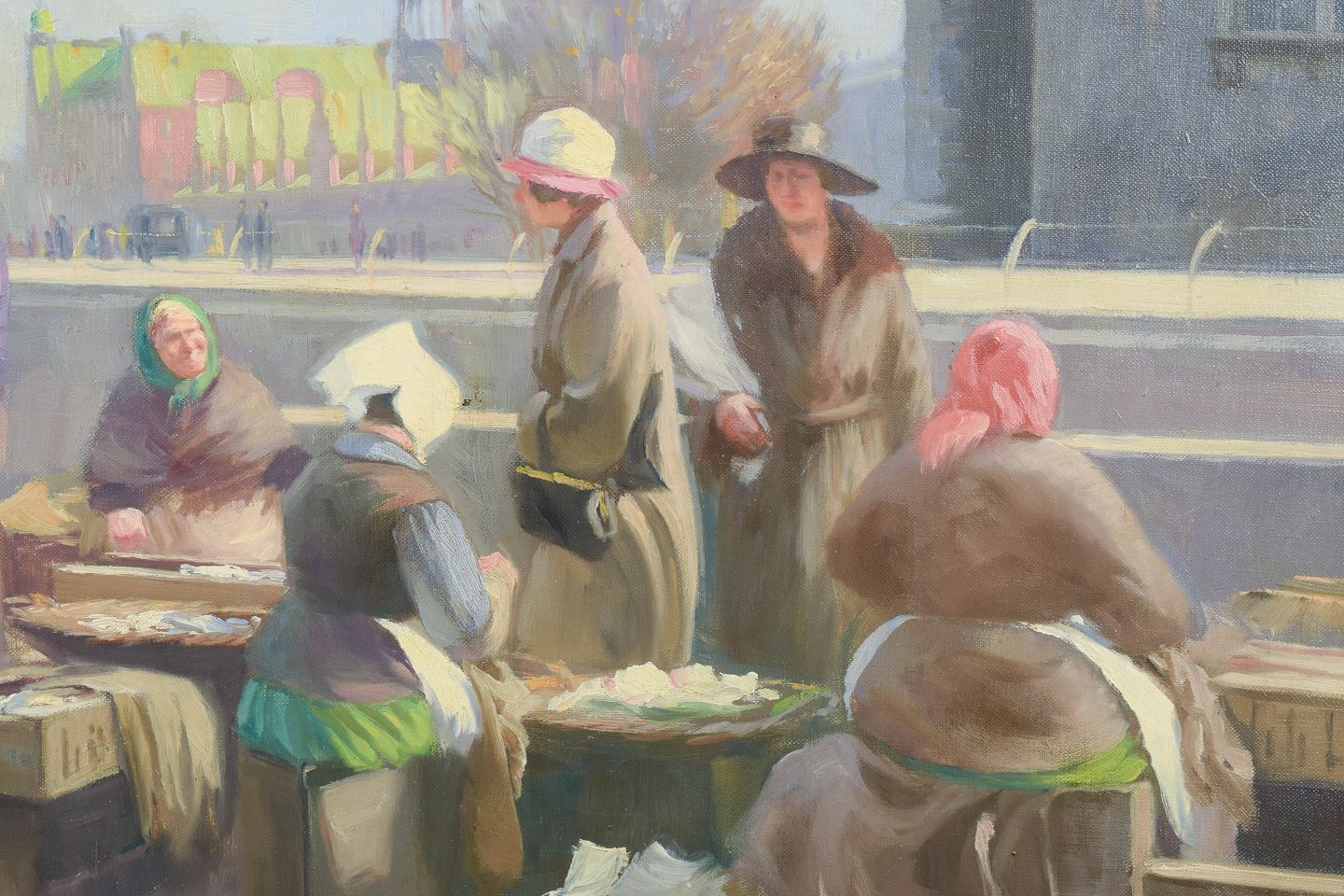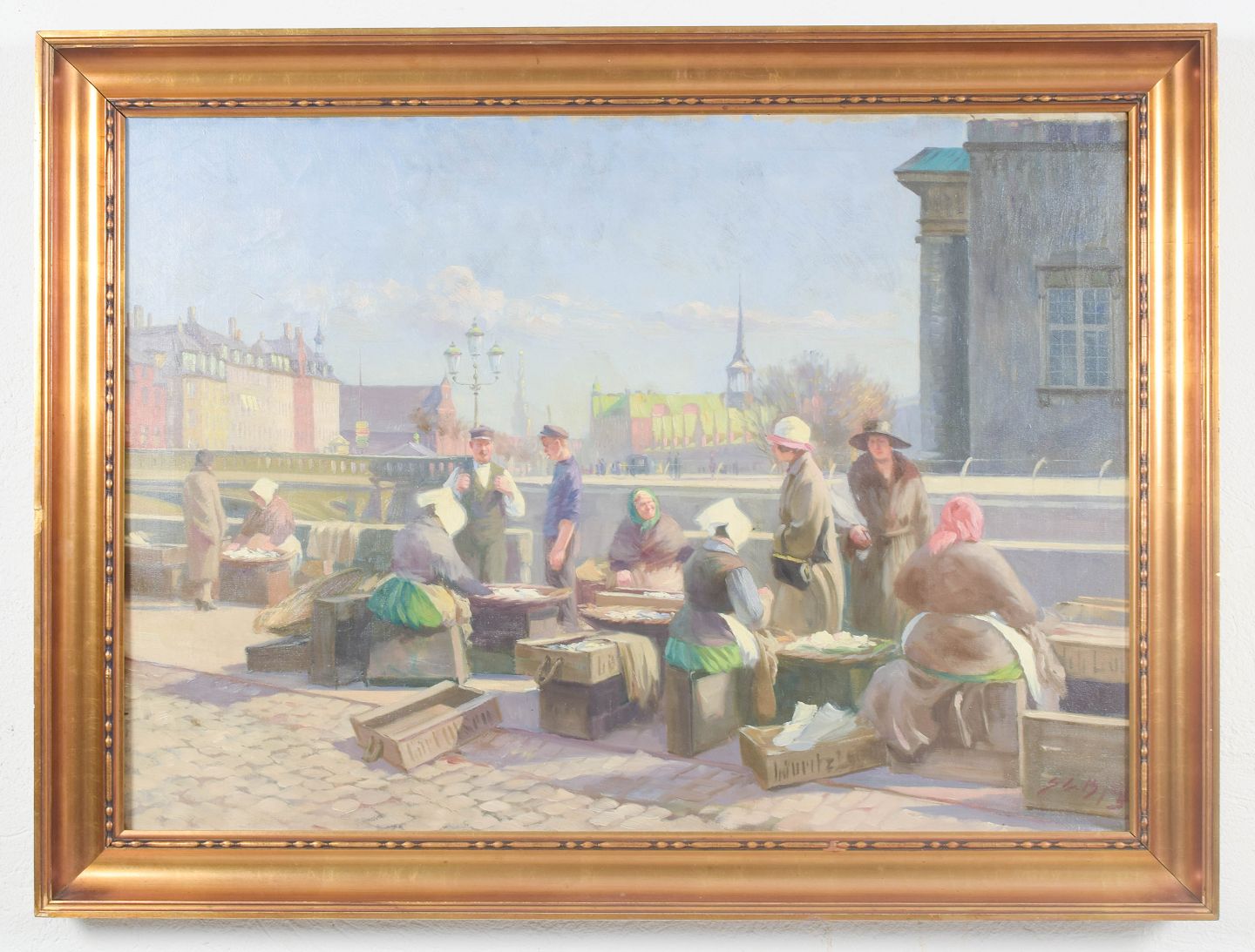Atmospheric depiction of life at Gammel Strand in Copenhagen with fish-selling women and everyday urban activity, executed as a naturalistic and light-filled oil painting. Signed.