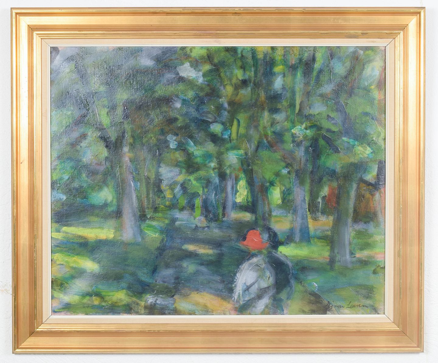 Modernist composition with a figurative motif set in a woodland landscape, executed with a loose and softly dissolved brushwork emphasizing light, colour, and atmosphere. Signed and dated 1965.