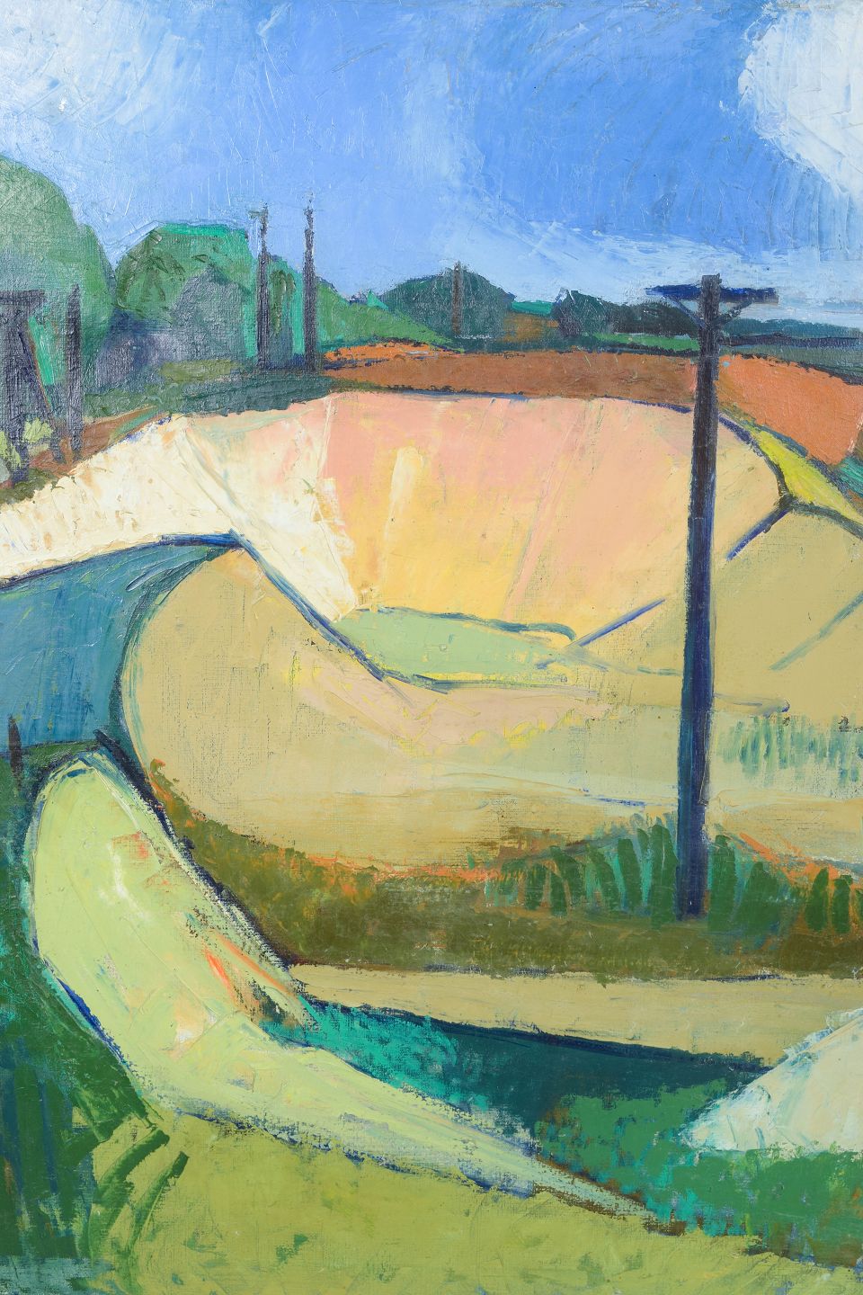 Colourful landscape composition executed in an early modernist style with soft, organic forms and simplified planes. The composition reflects a lyrical interpretation of nature, with fields, hills, and telegraph poles rendered in a decorative and semi-abstract manner. Executed in oil on canvas, unsigned.