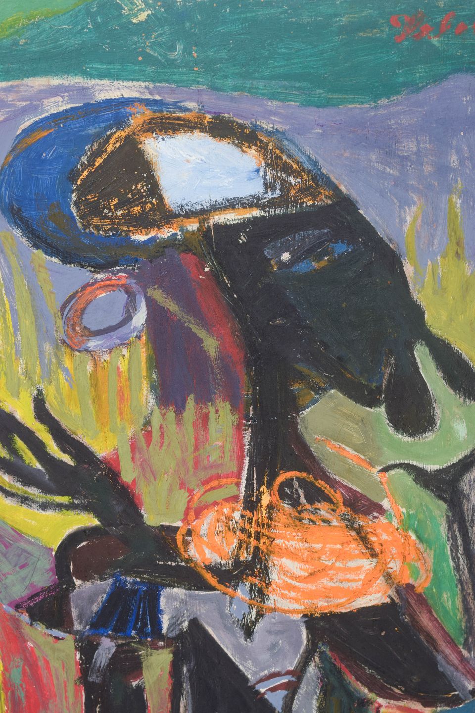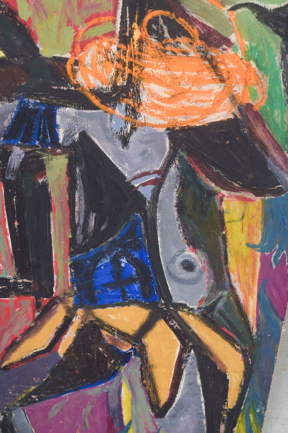Expressive and vividly coloured figurative composition depicting a stylised female figure rendered in an abstract modernist visual language. The composition is structured through bold outlines and contrasting colour fields in both bright and deep tones. Signed.
