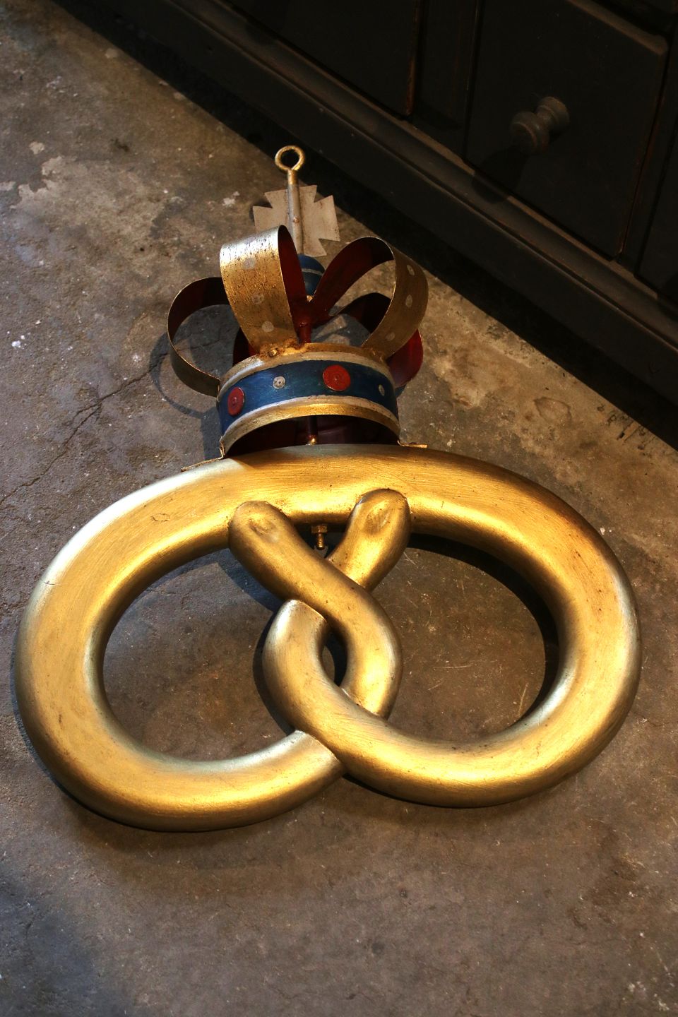 Old baker's sign shaped like a pretzel, gilded with a metal crown...
