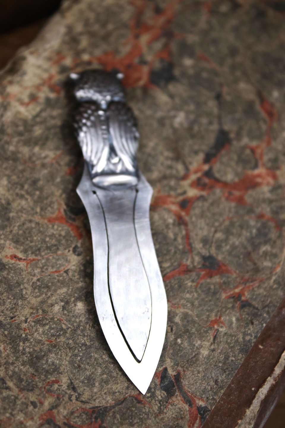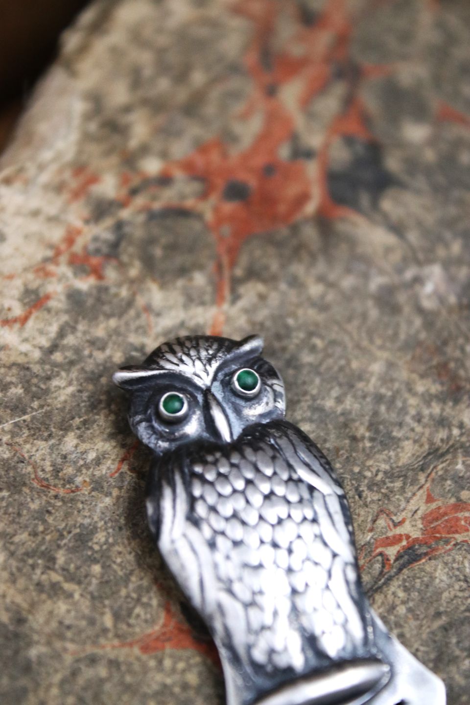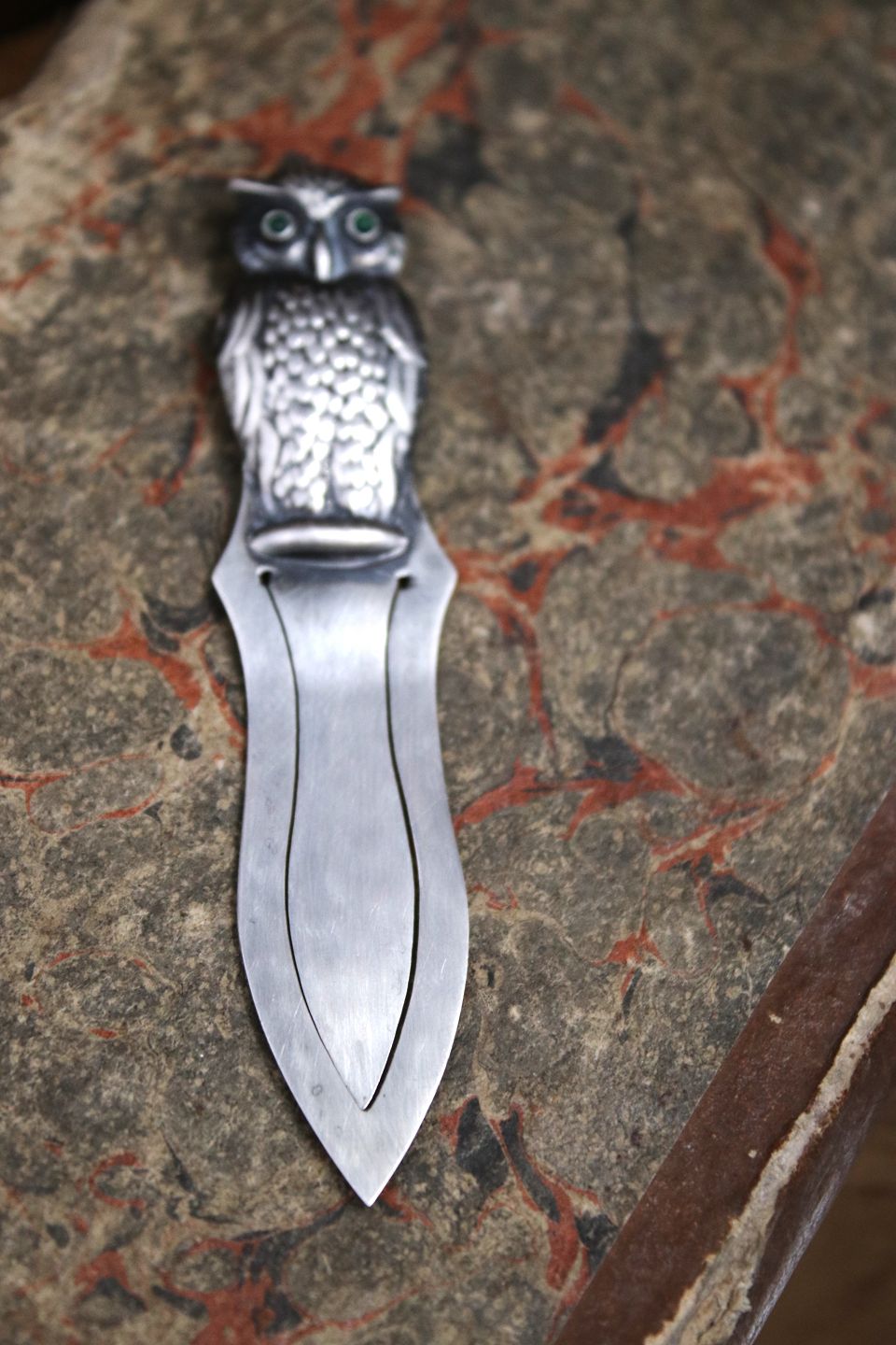 Old silver bookmark in the shape of a small owl with green glass eyes...