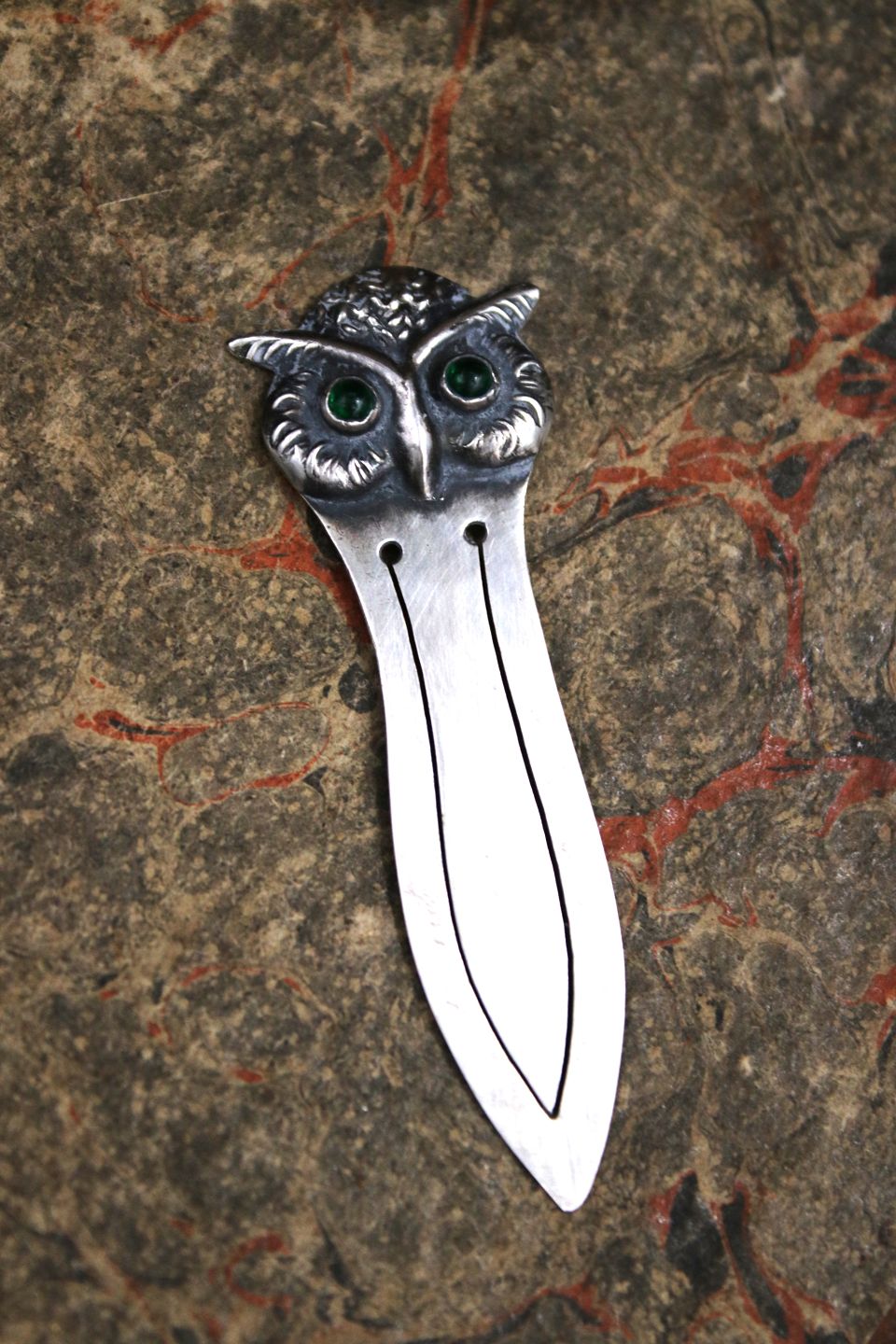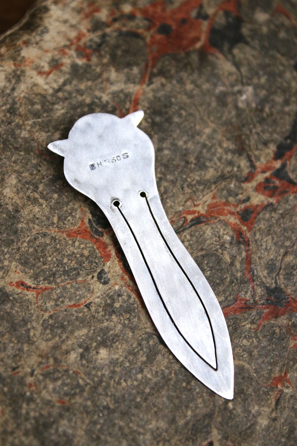 Old silver bookmark in the shape of a small owl with green glass eyes. Stamped 830s.
