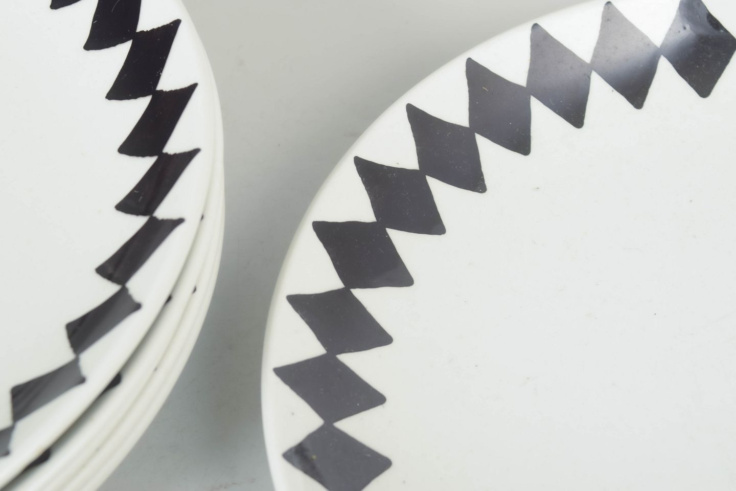 Set consisting of six small lunch plates in porcelain featuring a distinctive black diamond pattern, designed in a simple and functional style typical of the period.