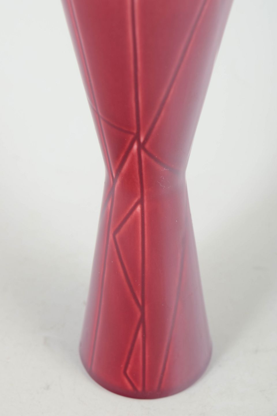 Slender hourglass-shaped vase in glazed stoneware with a deep red glaze and incised decoration. The model "California" is a characteristic example of Stålhane’s refined and disciplined ceramic design from the period.