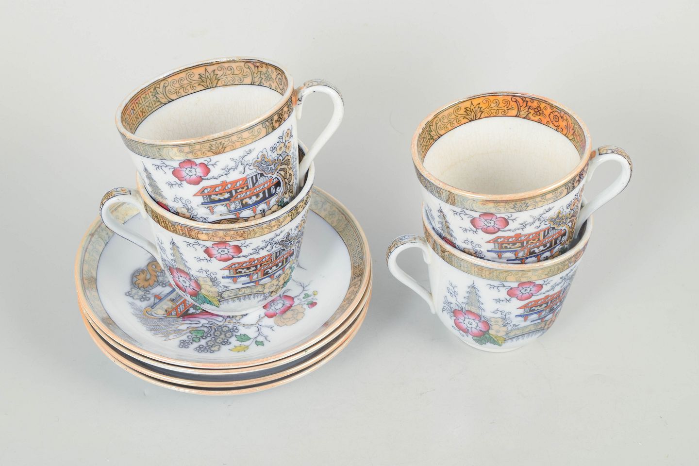 Large faience cups with matching saucers, decorated in a polychrome orientalist Japanese style featuring pagoda motifs, buildings, bird and floral elements. Model Japan, produced between 1866–1925 and dated to the 1880s.