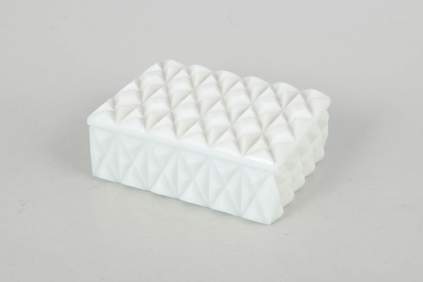 Rectangular lidded box in opaline glass with geometric relief decoration of repeating pyramid motifs. The white material has a subtle translucency that enhances the structured Art Deco design.