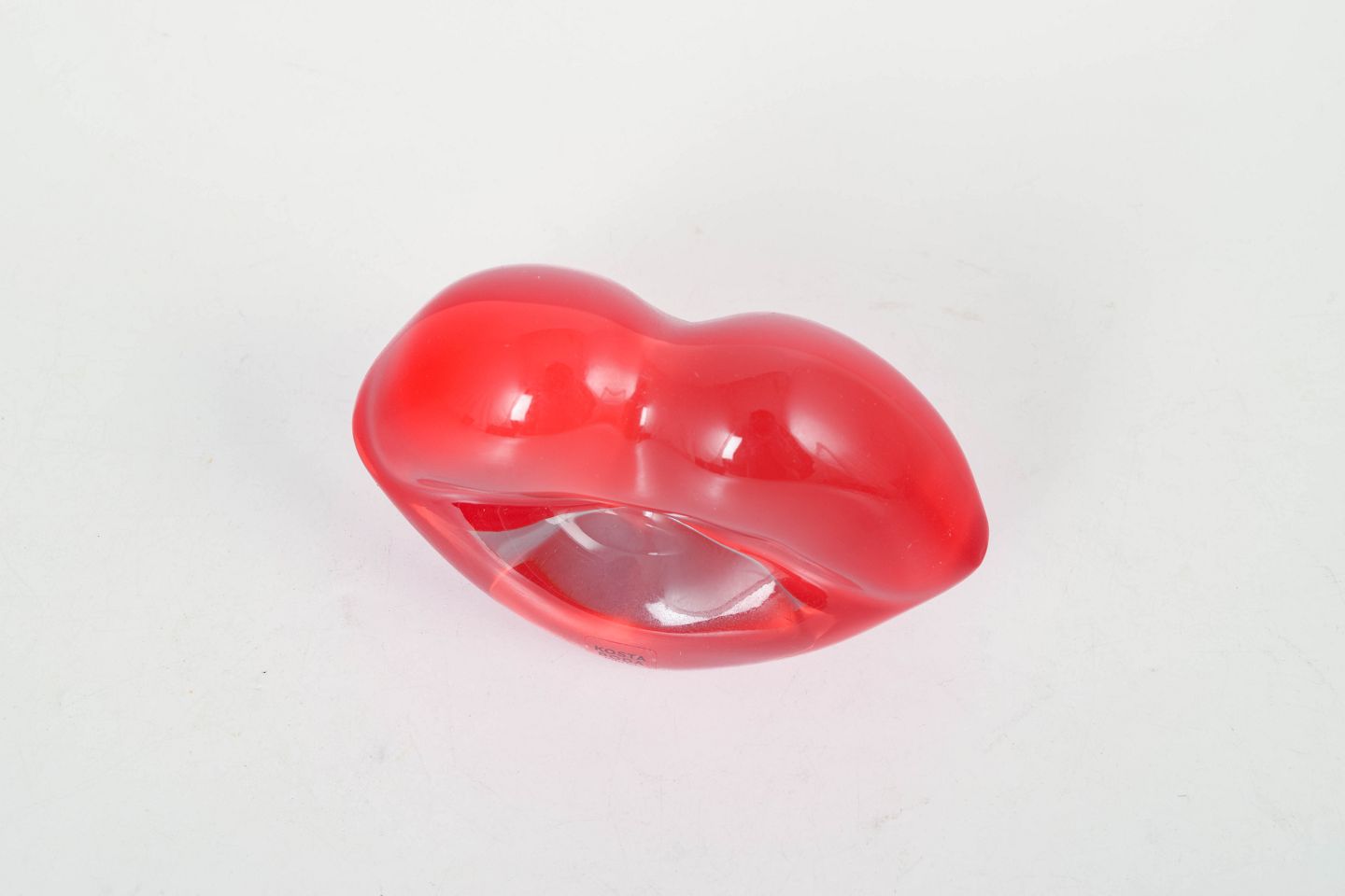 Sculptural lip-shaped form executed in solid red glass with soft organic lines and a transparent effect.