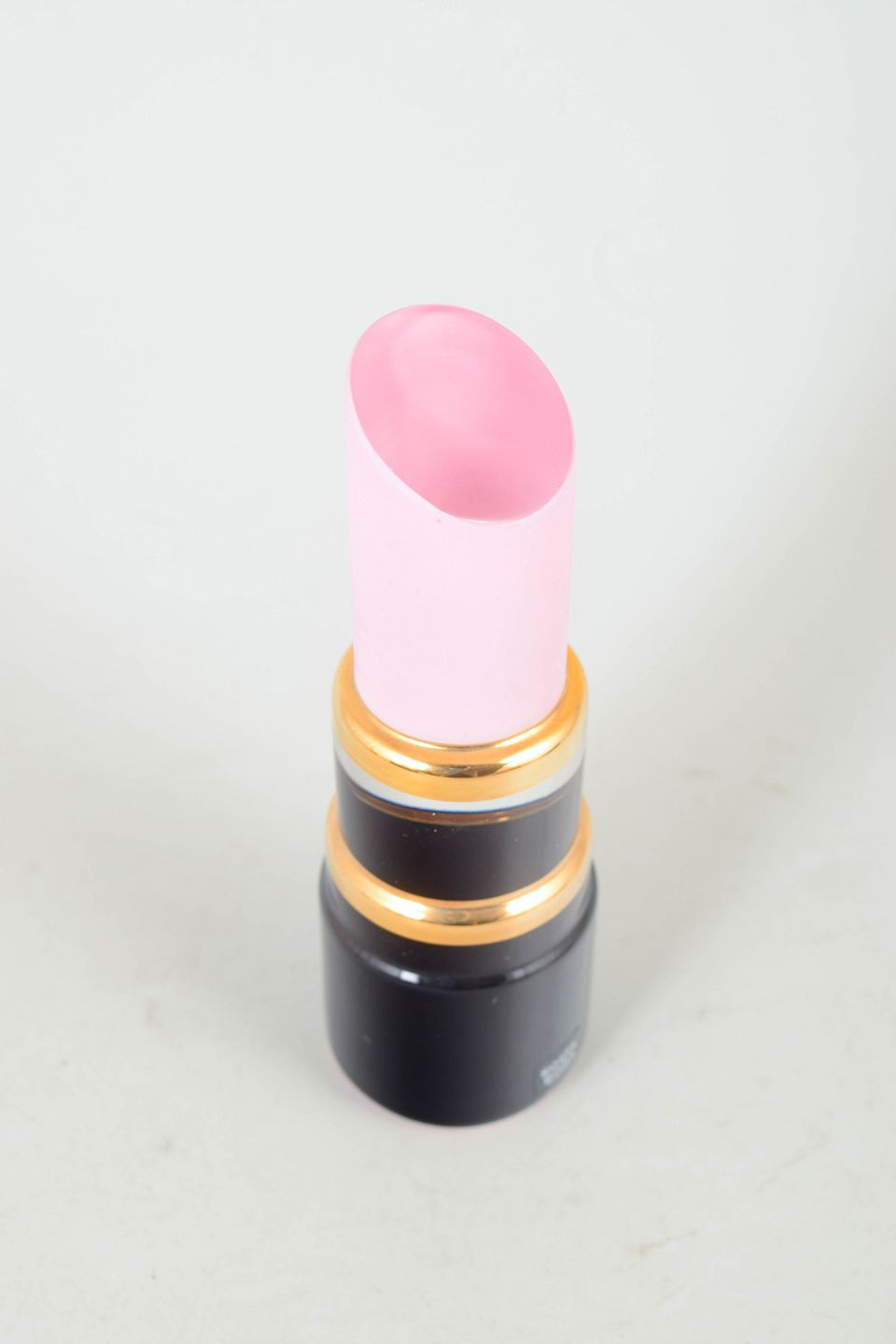 Slender layered glass sculpture in the form of a lipstick, with a cylindrical base in dark glass, ring-shaped elements in golden and clear tones, and an angled top in pink glass.
