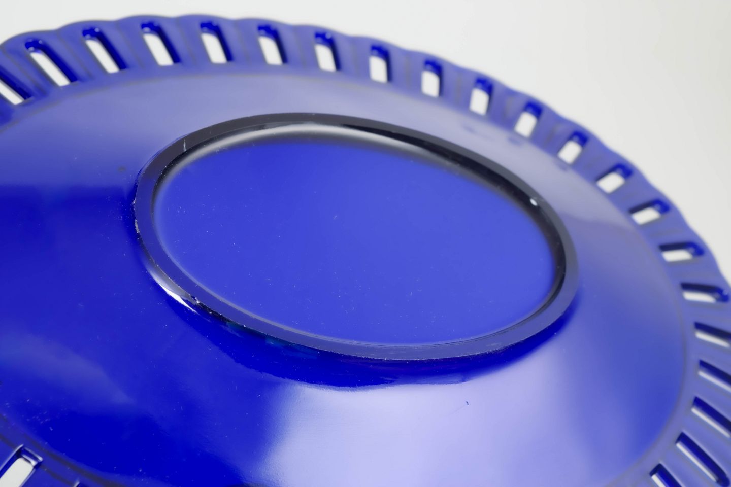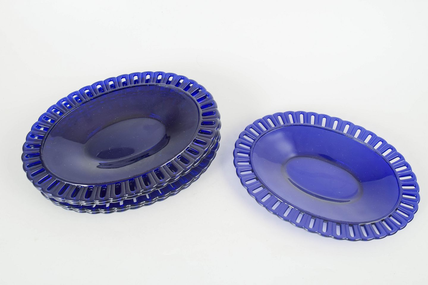 Elegant pressed glass plates in deep cobalt blue with a distinctive openwork rim in filigree design. A striking example of Swedish glass design from the mid 20th century.