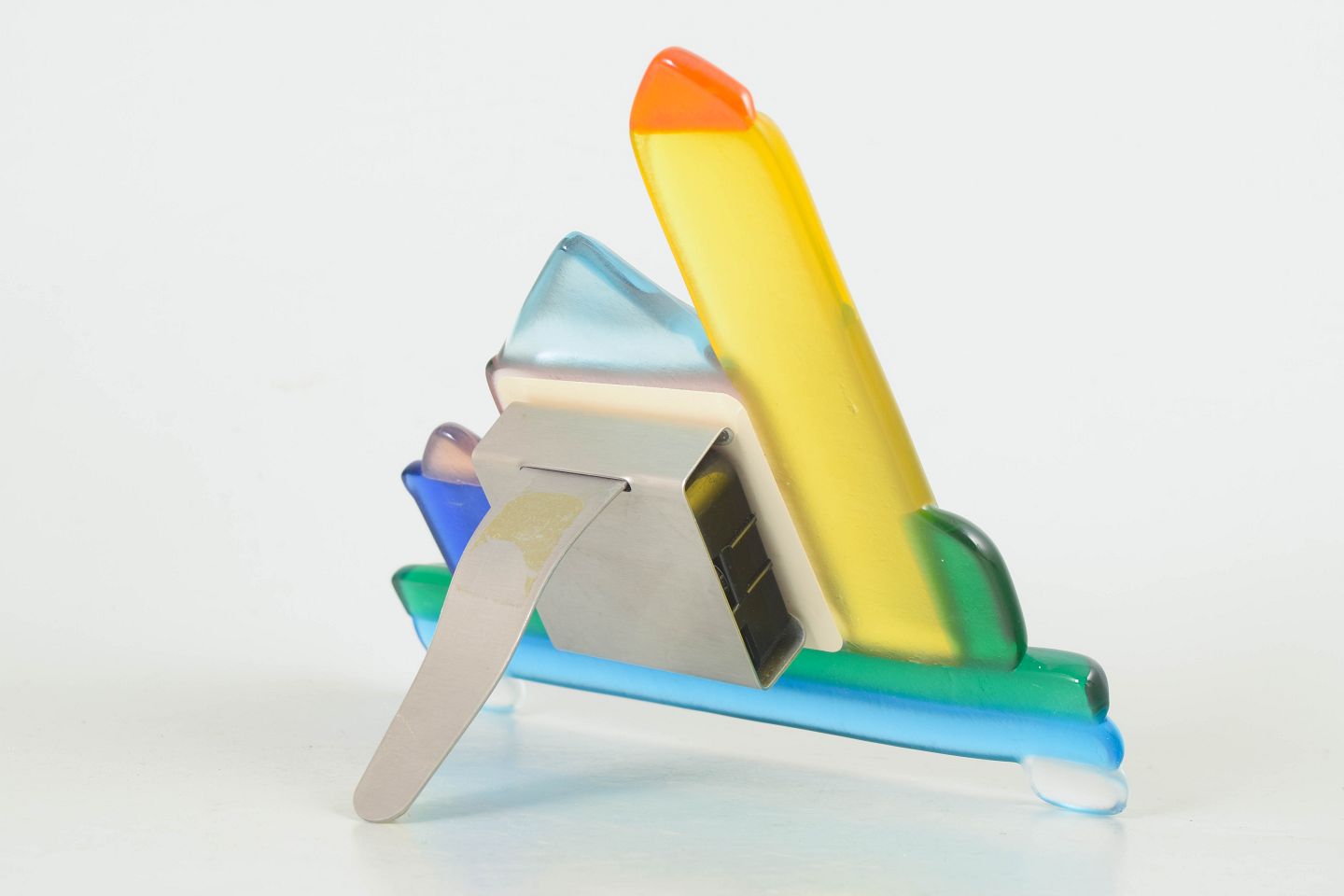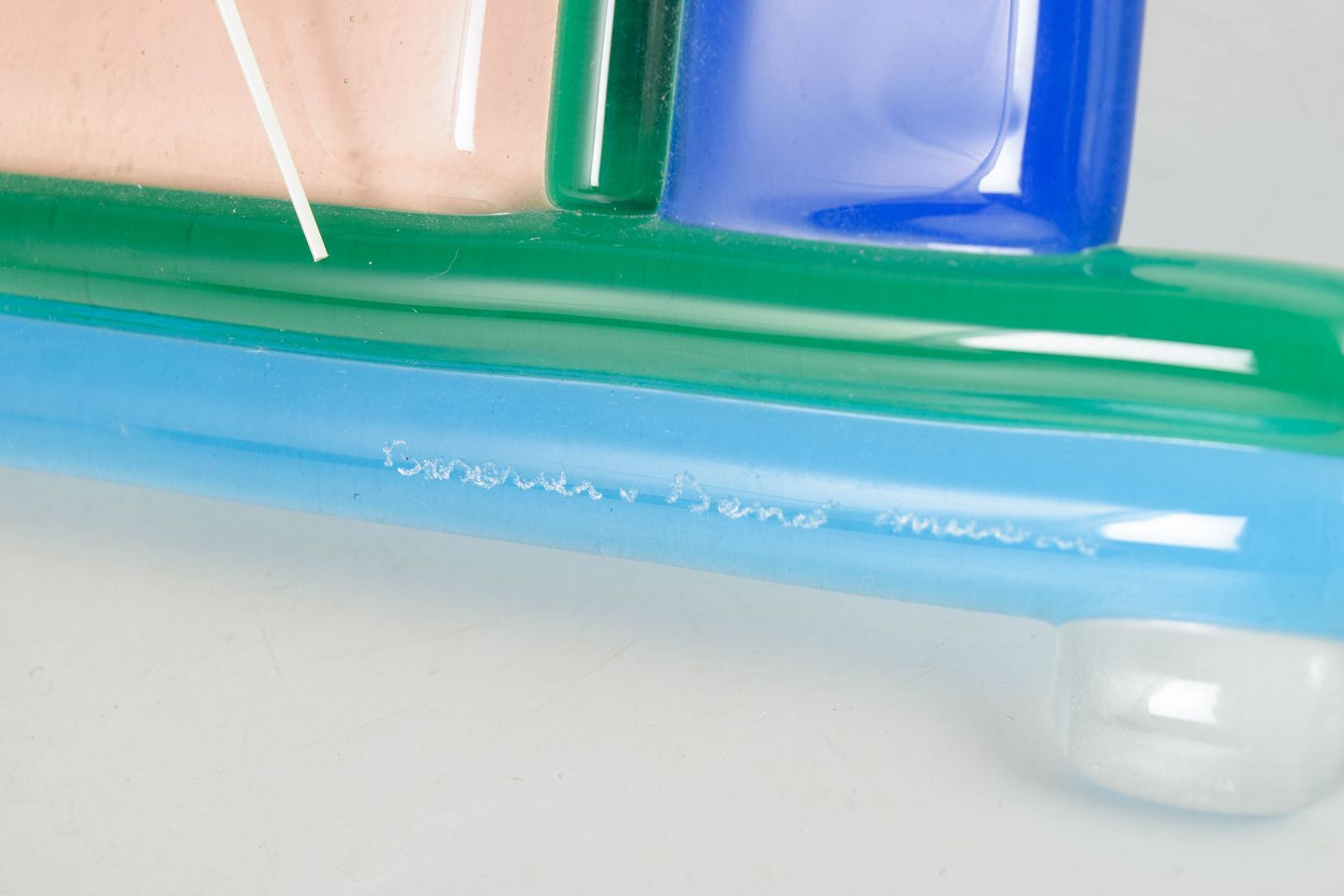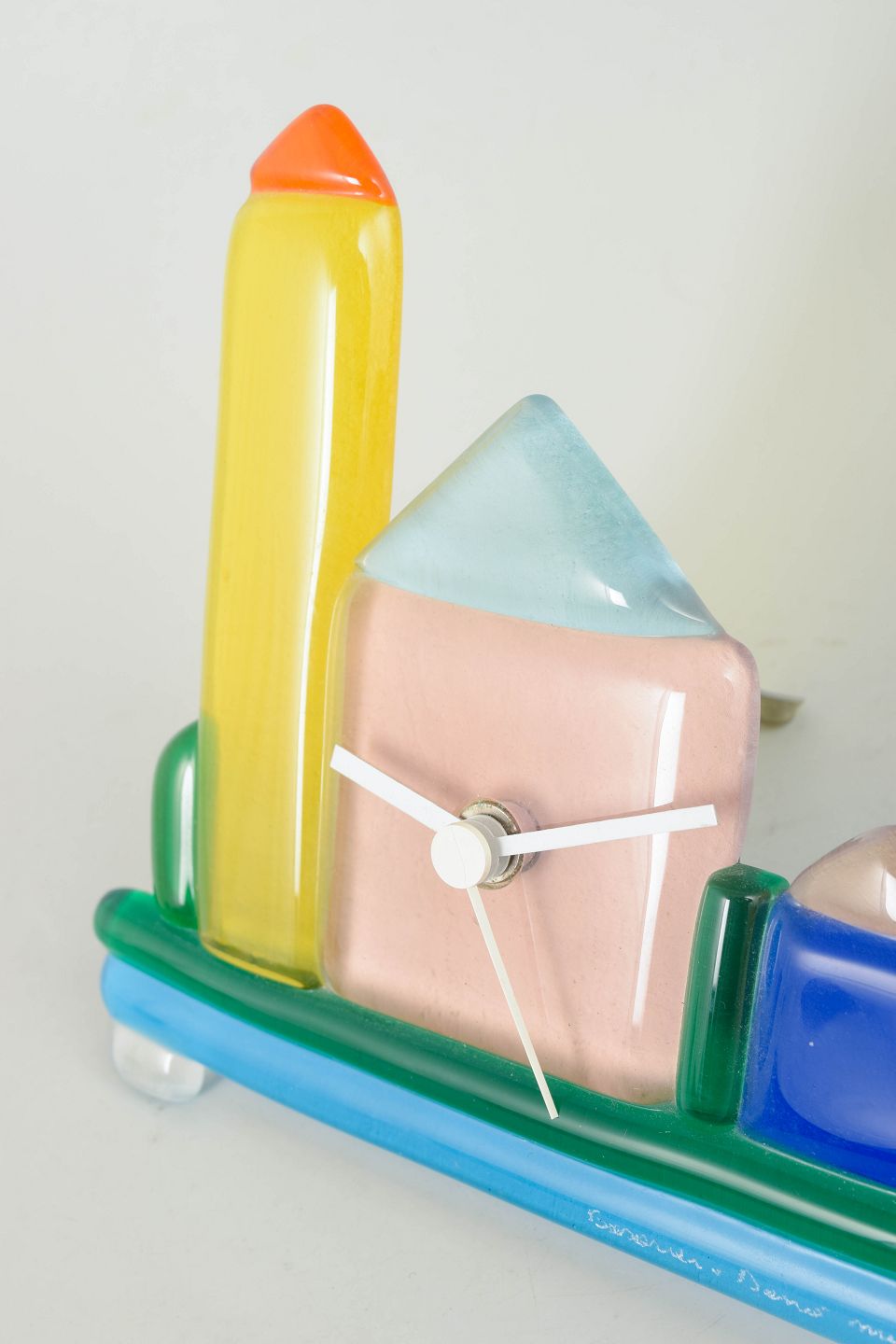 Decorative table clock in vibrant mouth-blown Murano glass, executed in a postmodern style with geometric and playful forms. Signed and representing a characteristic example of Italian glass design from the 1980s.