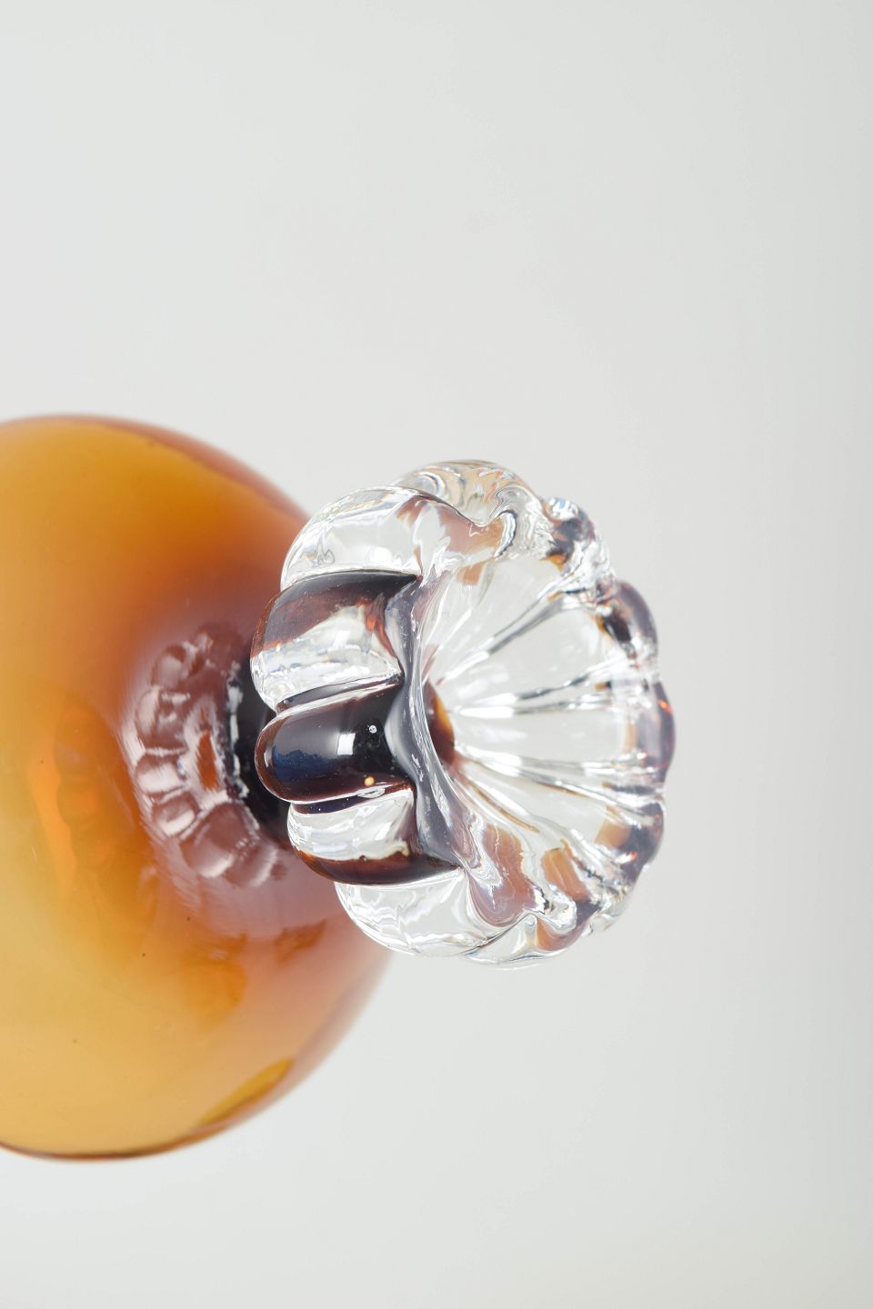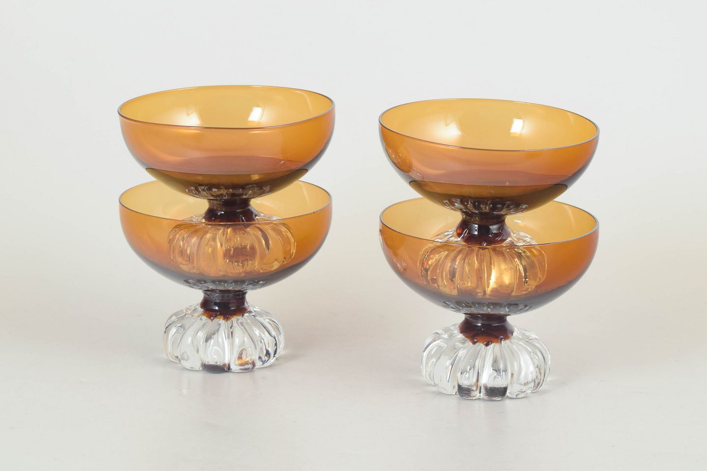 Elegant dessert bowls in mouth-blown glass with amber-coloured bowls and decorative clear glass stems with ribbed detailing, characteristic of Swedish glass design of the period.